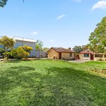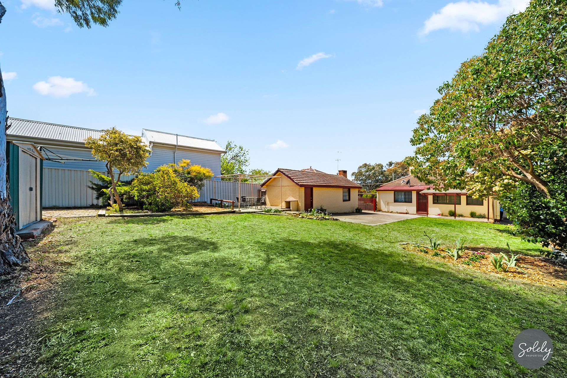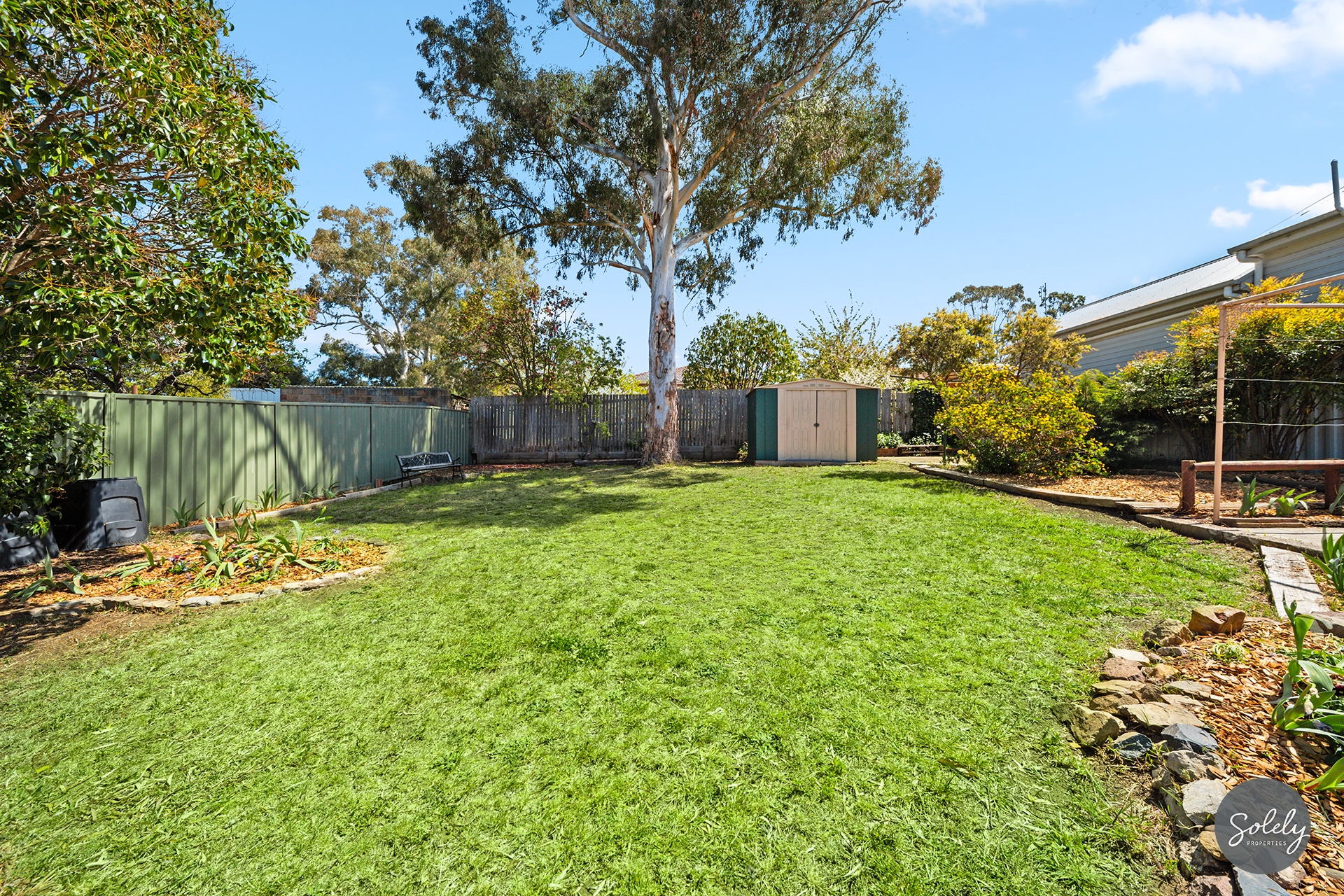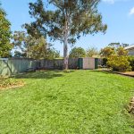 * The backyard is a secure, spacious blank canvas, with Colorbond fencing on two sides and timber on the third, surrounding an expansive grassed area and established plants