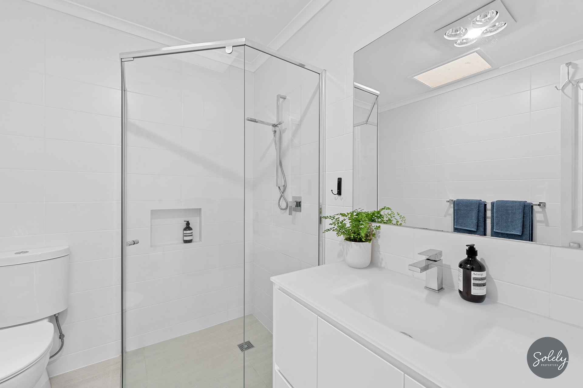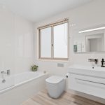 The main bathroom mirrors the sophistication of the ensuite, finished in timeless neutral tones and complete with floor-to-ceiling tiling, shower over bath with rain shower head, under-tile heating, heated towel rail, heated mirror with inbuilt lighting, floating vanity and concealed cistern.