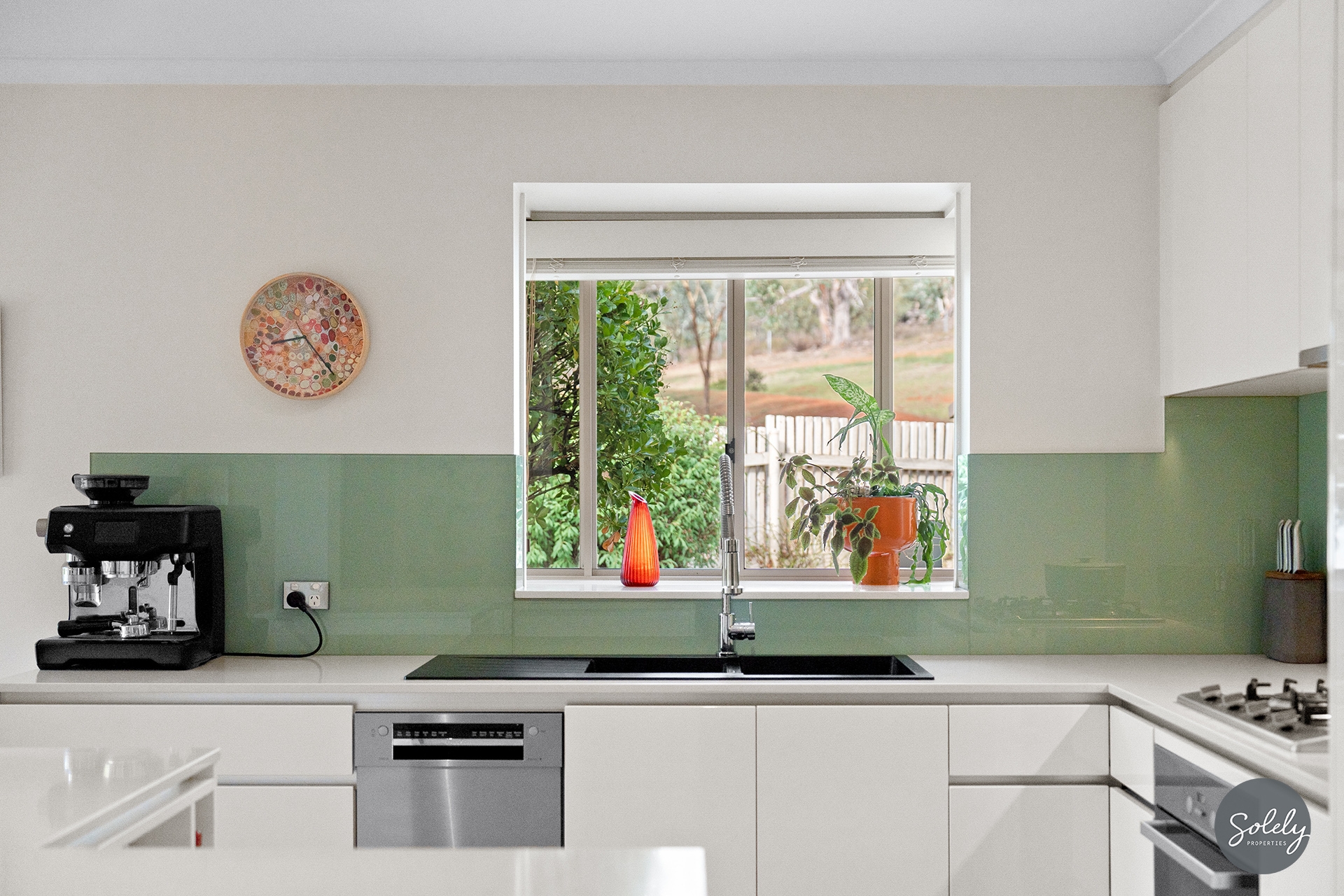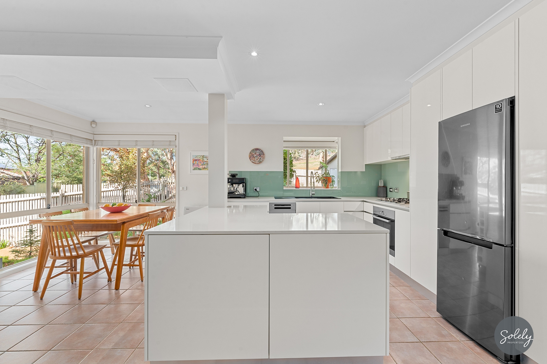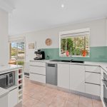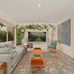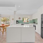 The heart of the home is a light-filled open plan kitchen, meals and living space ideal for entertaining. The kitchen is a standout: stone benchtops (including a central island), a Bosch stainless steel dishwasher, Miele oven and gas cooktop, and a striking black sink with pull-down tap set into a bay window. There’s ample storage and a layout that connects effortlessly to the dining and living zones.