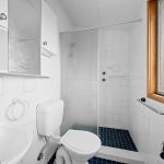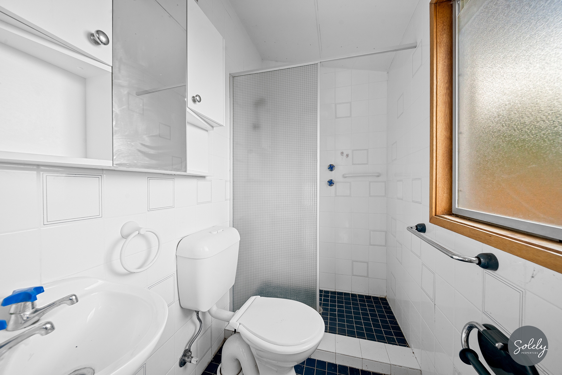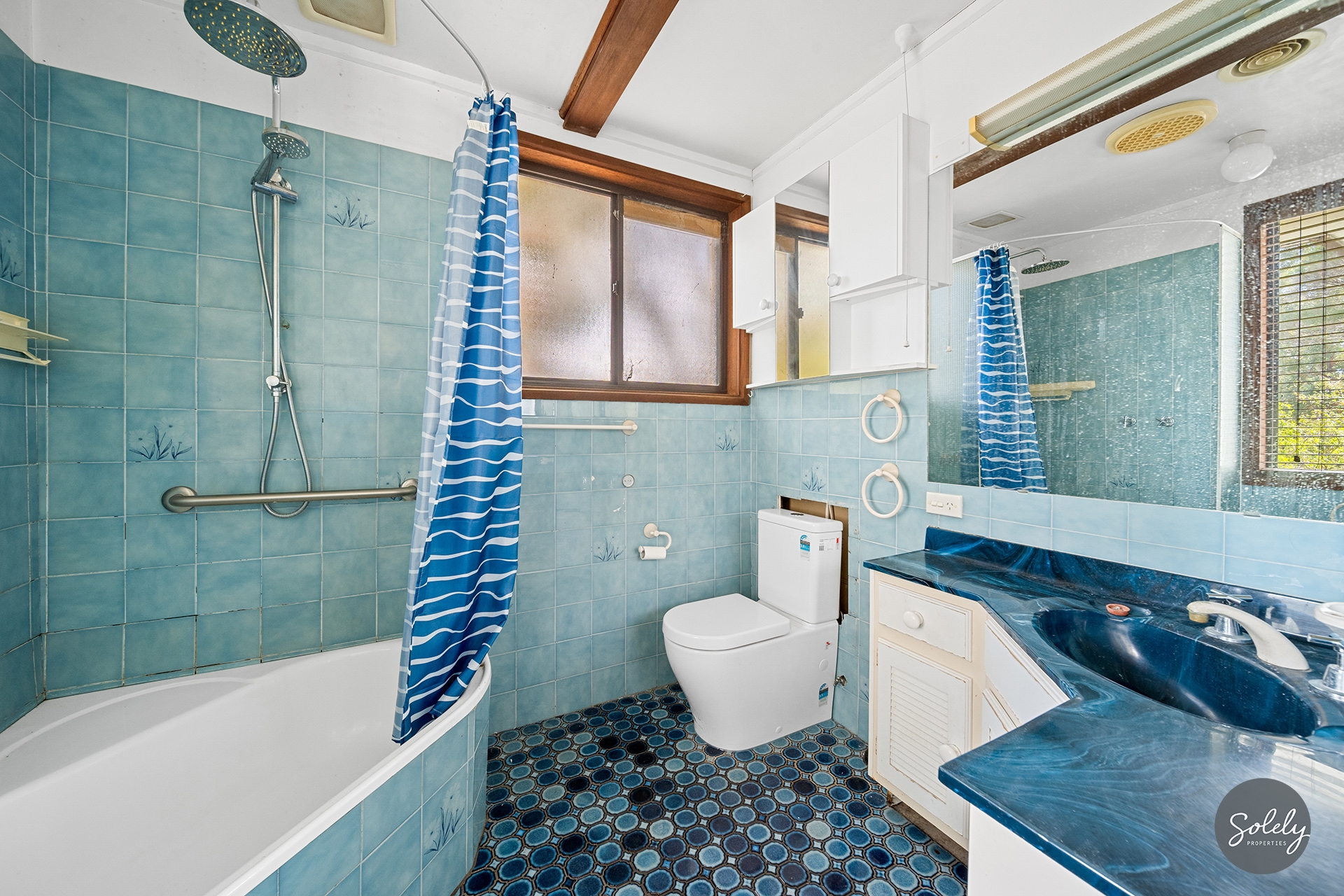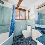 * The main bathroom features a combined bath/shower with rainfall head, a blue tiled vanity and a toilet with partially recessed cistern