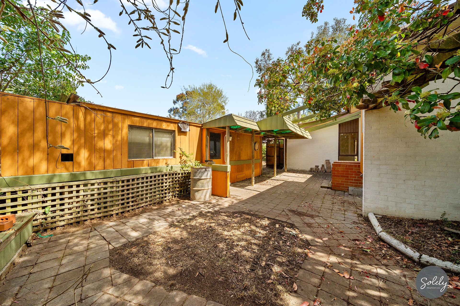 Outdoors, the front courtyard has a partially covered deck and a paved area, and the back garden offers scope for re-landscaping, entertaining, or extension. A granny flat sits at the rear, in original condition, offering a renovation project or the option for a complete rebuild.