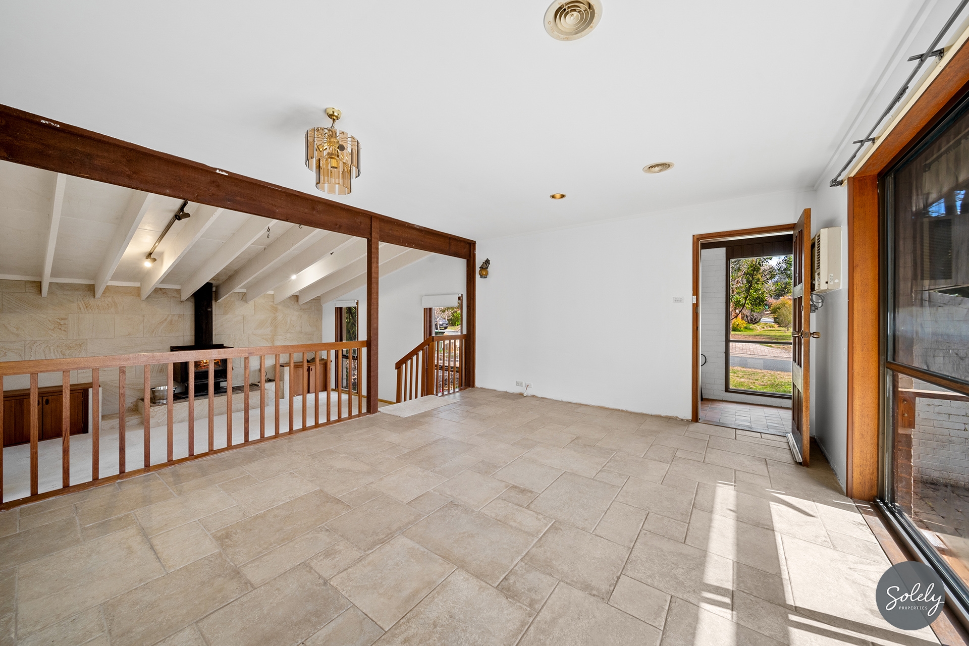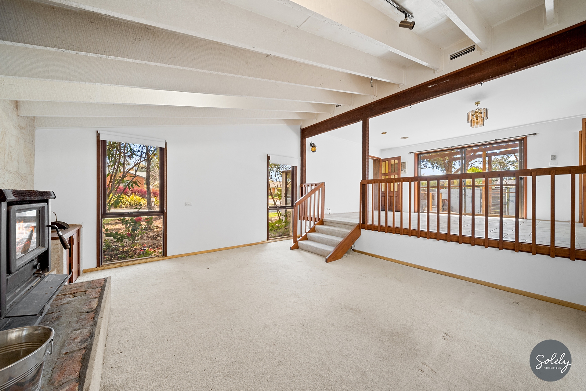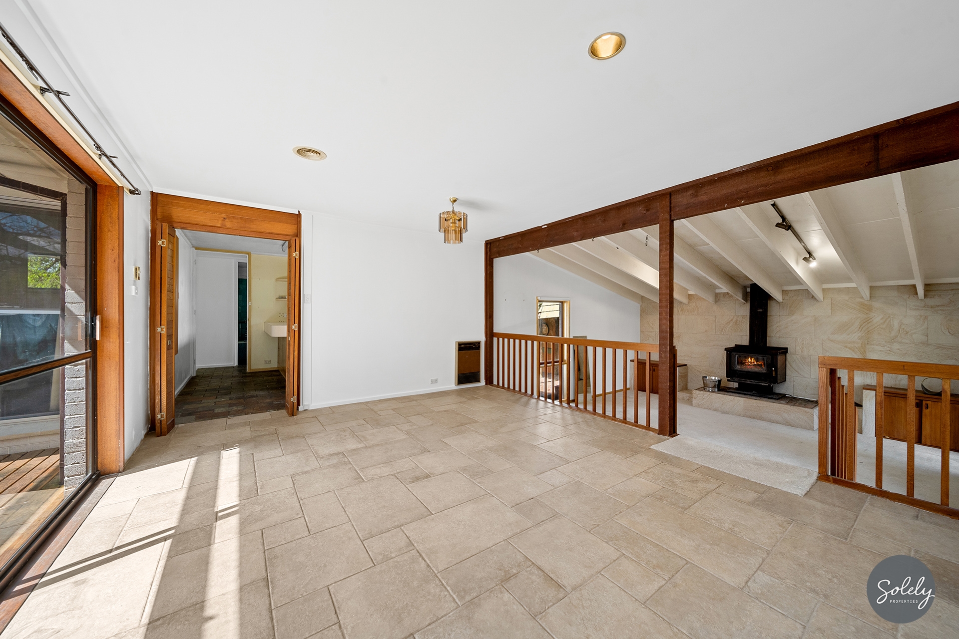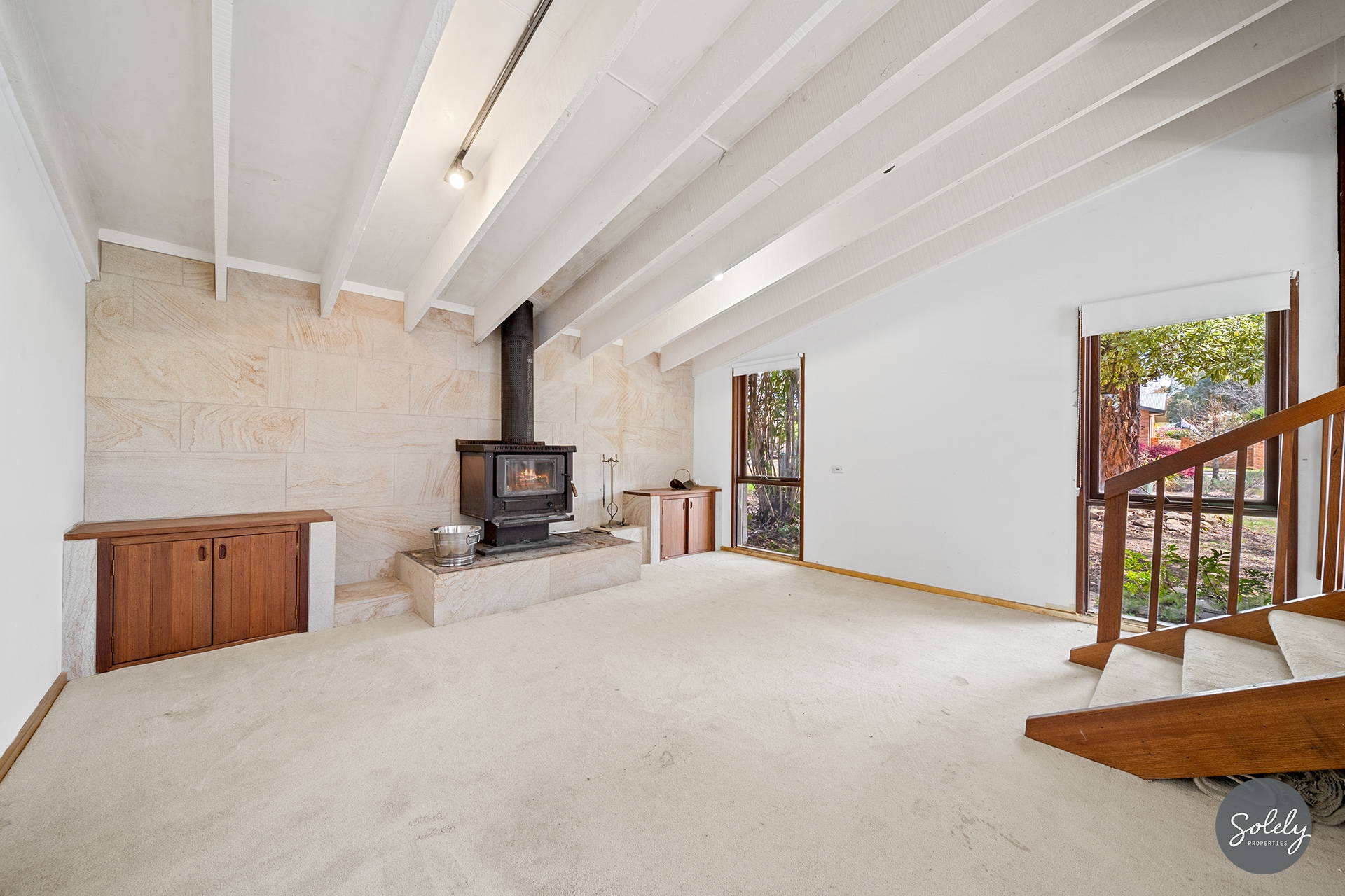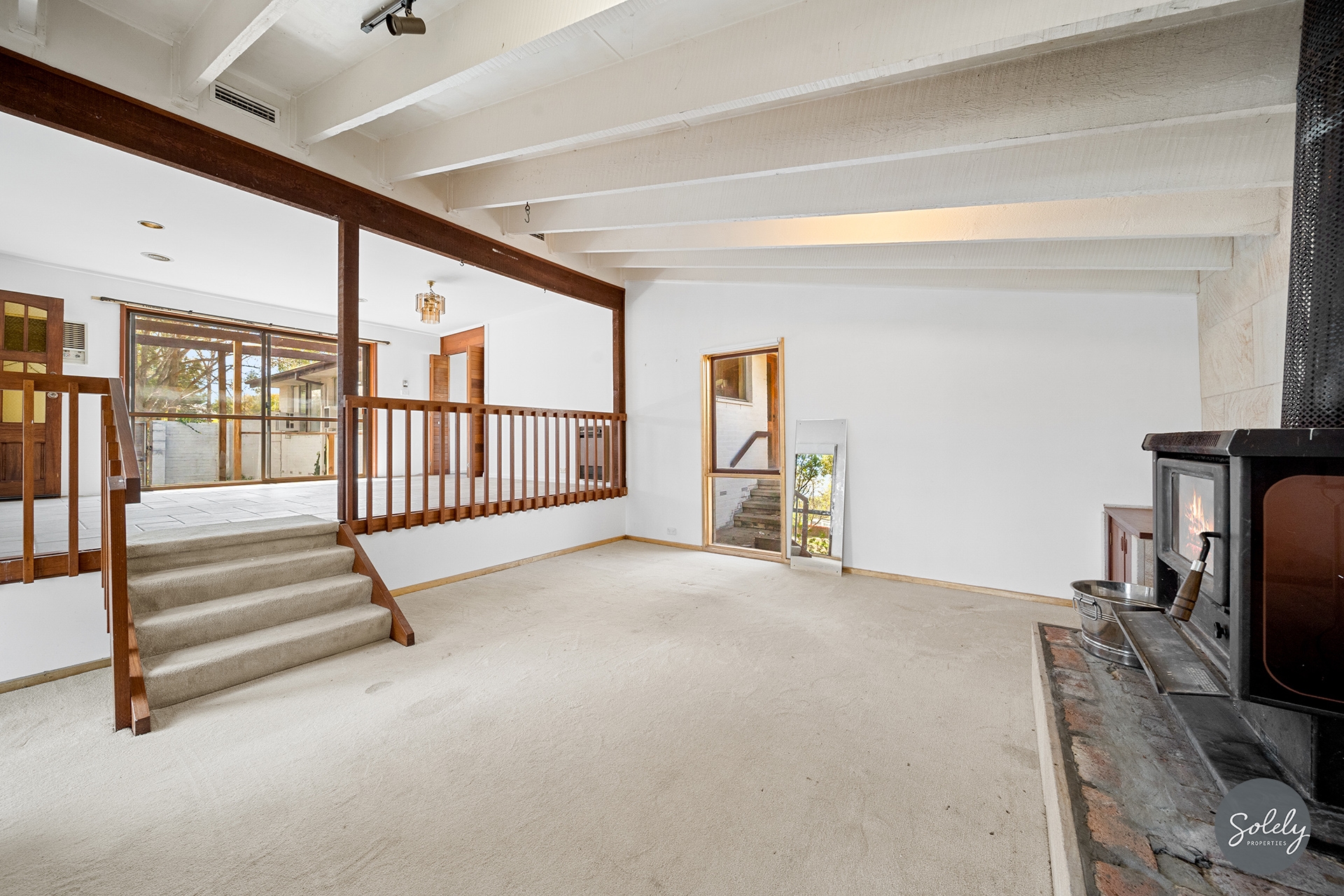 * Character filled carpeted sunken lounge room features exposed painted timber beams, a slow combustion heater, and is enhanced in it’s design with a statement sandstone feature wall