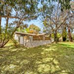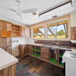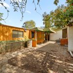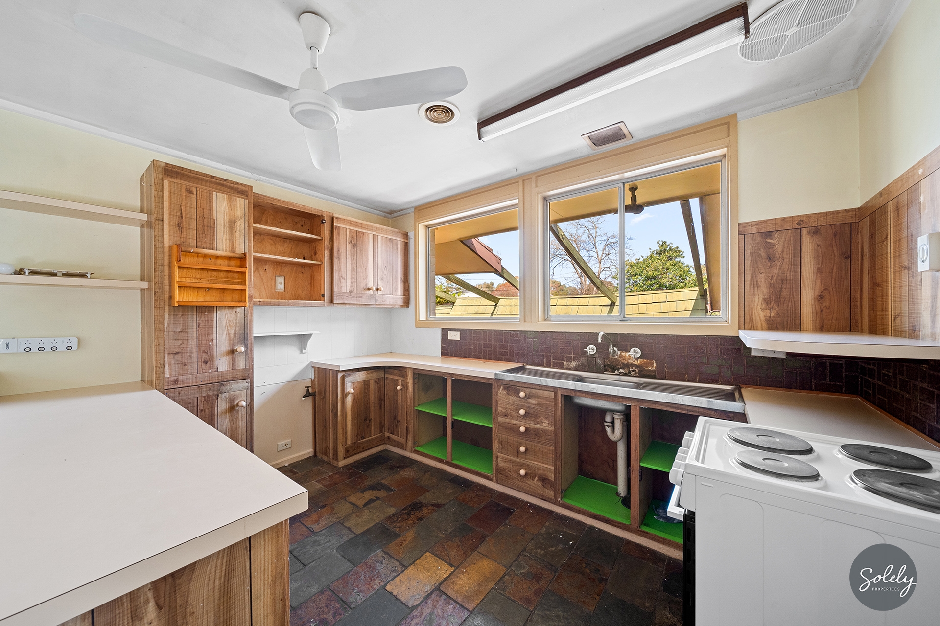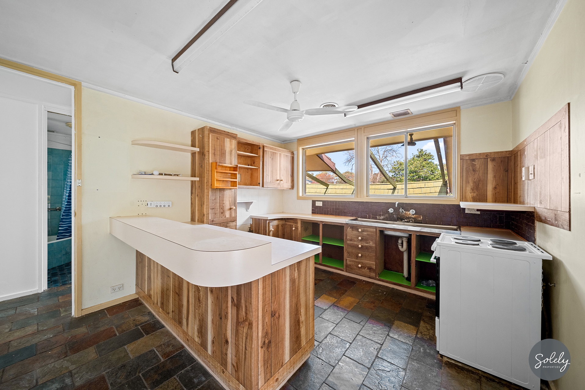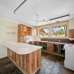 Inside, the sunken lounge room exudes character with painted timber beams, a slow combustion heater, and a bold sandstone feature wall, proof that this home has personality to spare. Adjacent, a tiled dining room awaits your culinary experiments, while the original kitchen is ready for your touch, featuring wood cupboards, laminate benchtops, a breakfast bar, a pull-out ironing board, and a Westinghouse freestanding oven and cooktop.