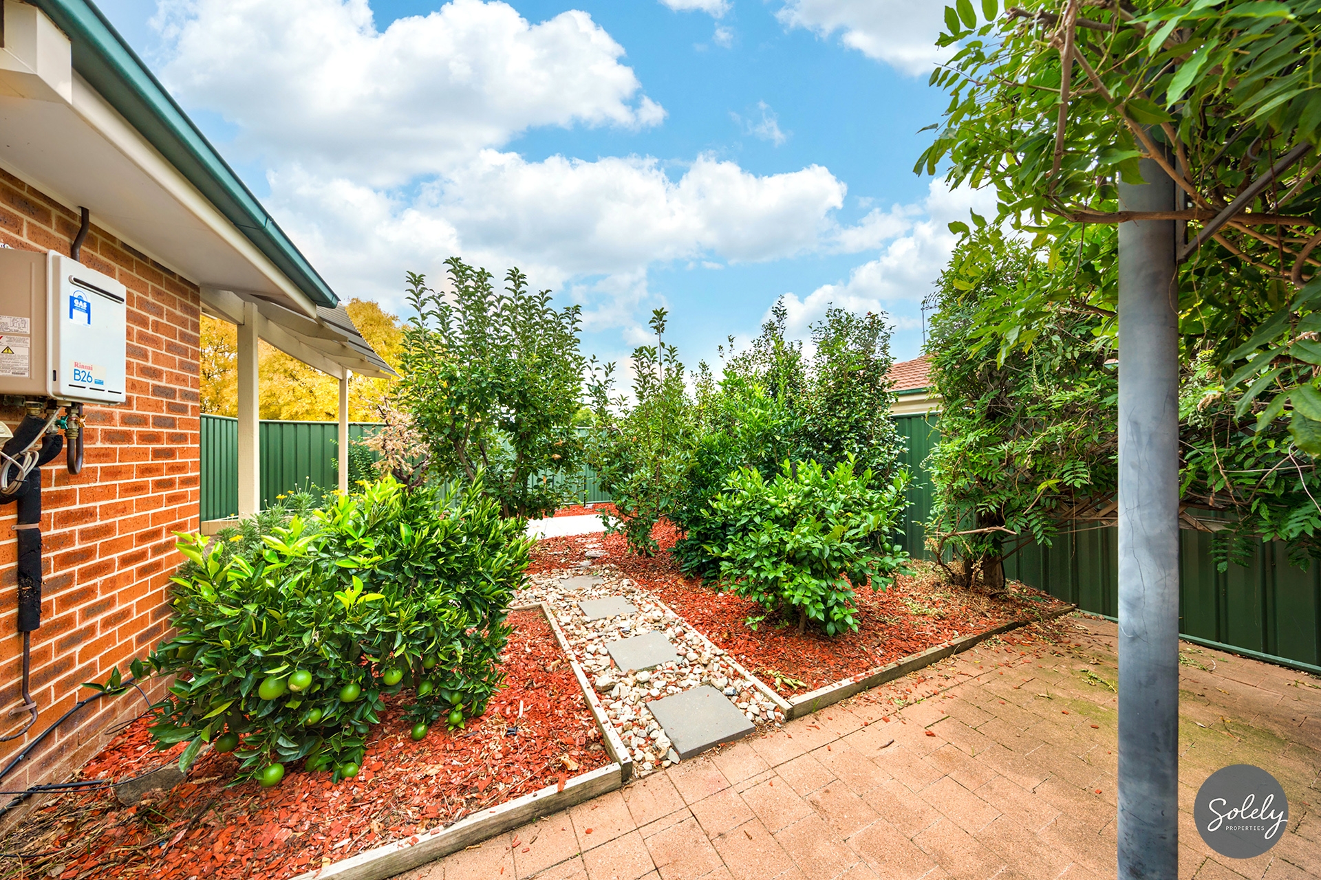 * Beautiful low-maintenance garden with an entertaining area and established plants, including a stunning wisteria over a gazebo and beautiful fruit trees