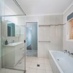 The bathroom is designed with a clever two-way layout that offers the convenience of an ensuite while remaining accessible to the rest of the household. This space includes a stone-topped vanity, a mirrored cabinet, and both a bathtub and a separate shower. To ensure the home remains comfortable through every Canberra season, a Mitsubishi reverse-cycle air conditioner manages the internal temperature, while a Rinnai B26 continuous flow system provides efficient, on-demand hot water.