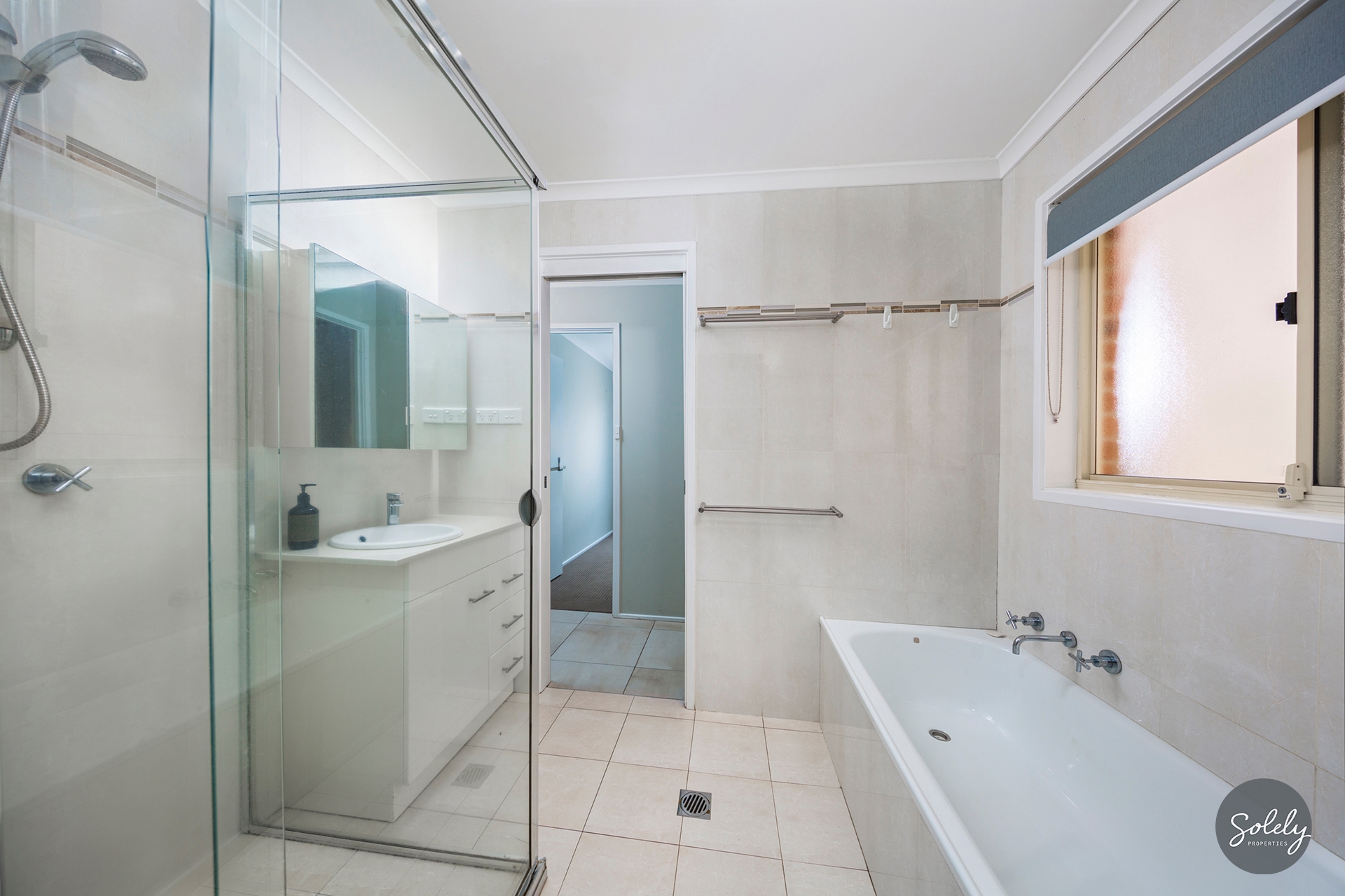 * A clever two-way layout makes the bathroom both functional and comfortable, with space for a bath a separate shower, a stone topped vanity, a mirrored cabinet and toilet