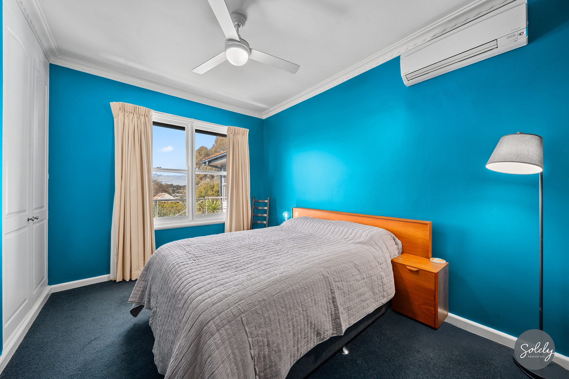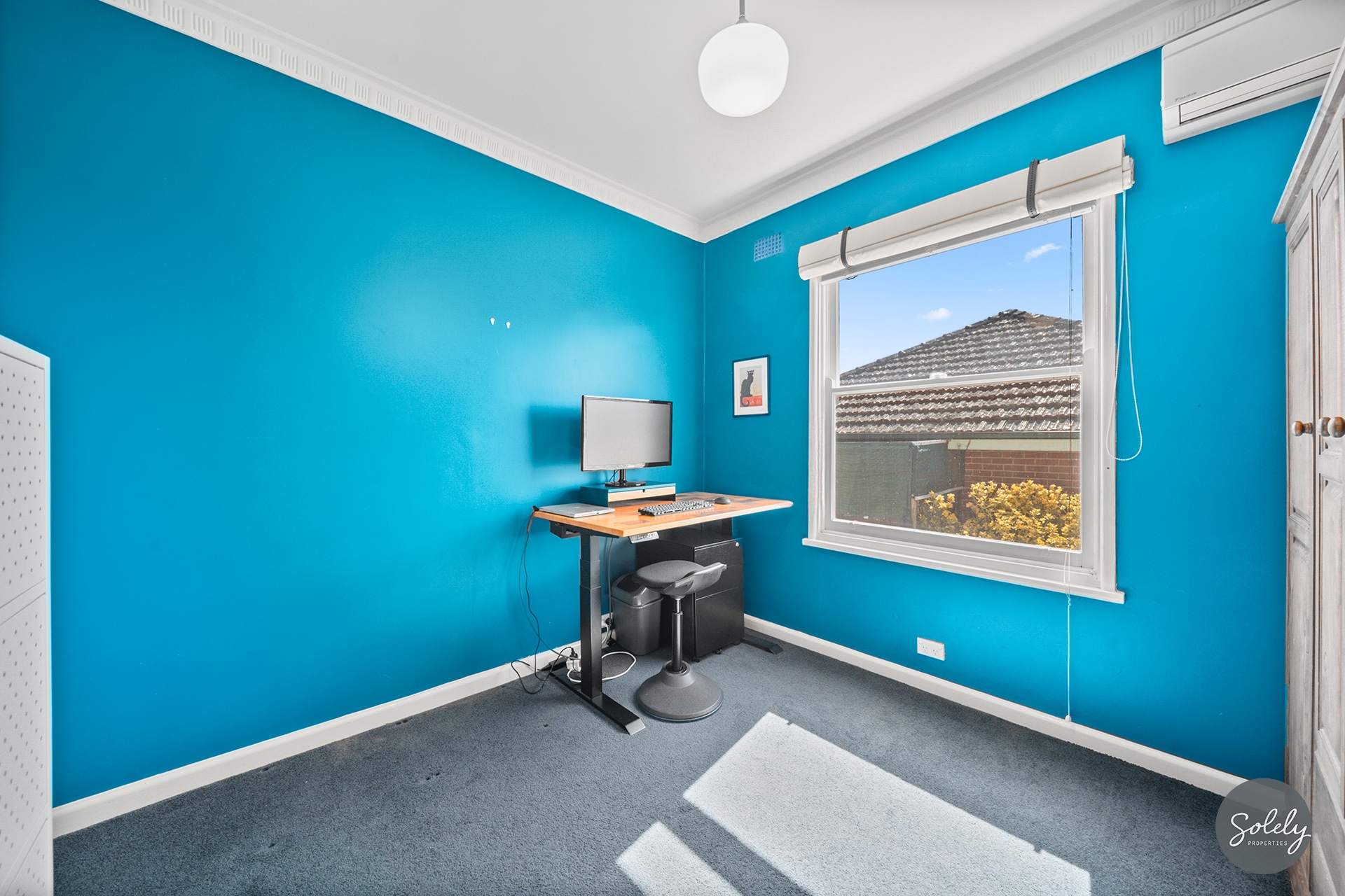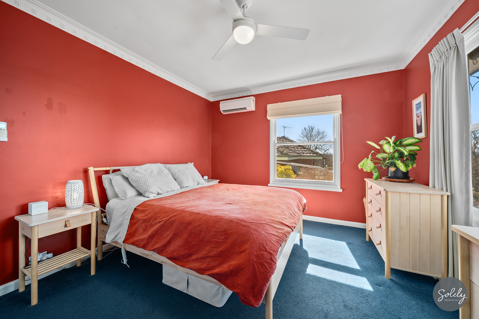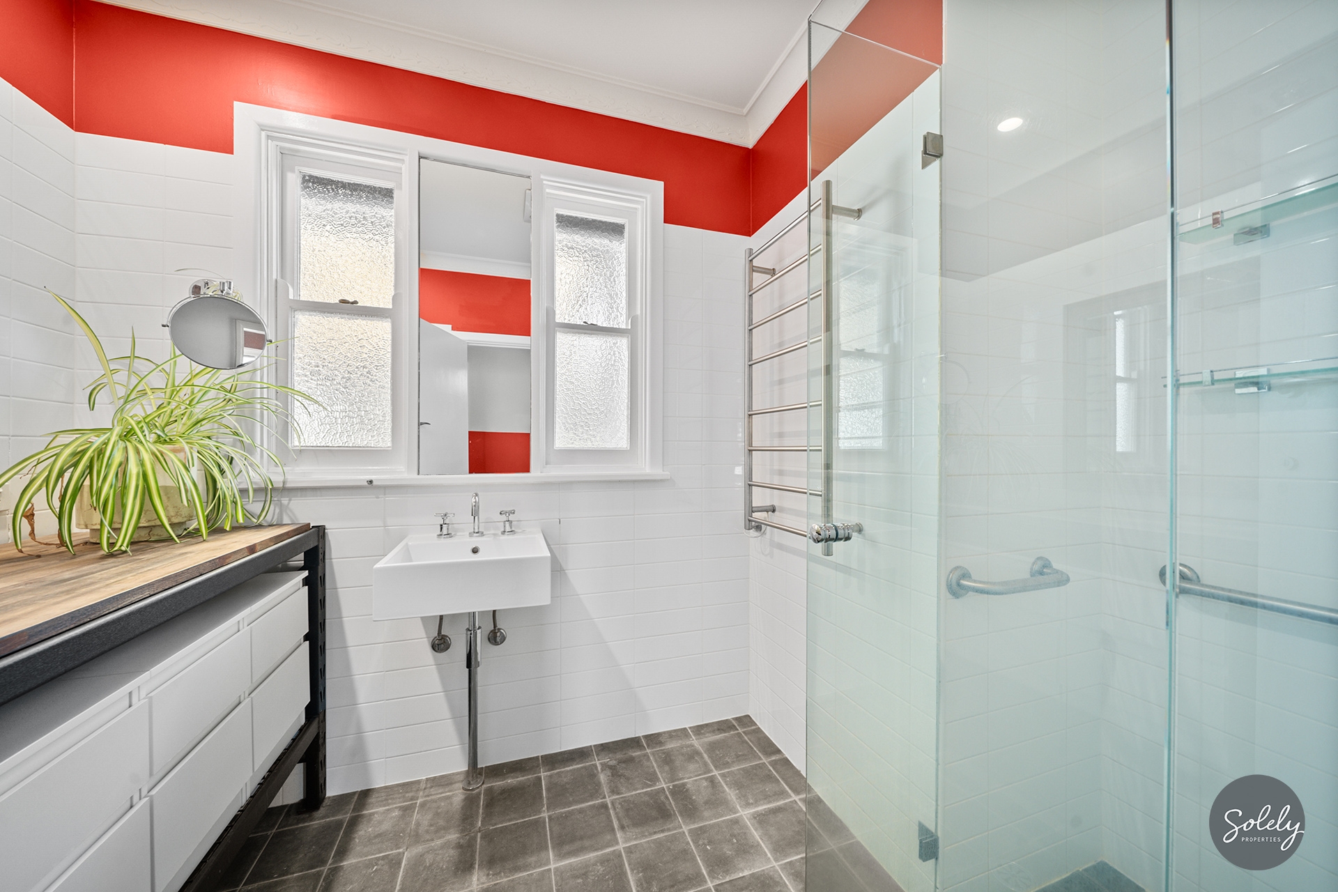 The main home offers three bedrooms, each with built-in robes and reverse-cycle air conditioning, all set along a wide hallway. Period features such as patterned cornices and statement lighting add charm, while the renovated family bathroom is finished with white subway tiles and a frameless glass shower screen.