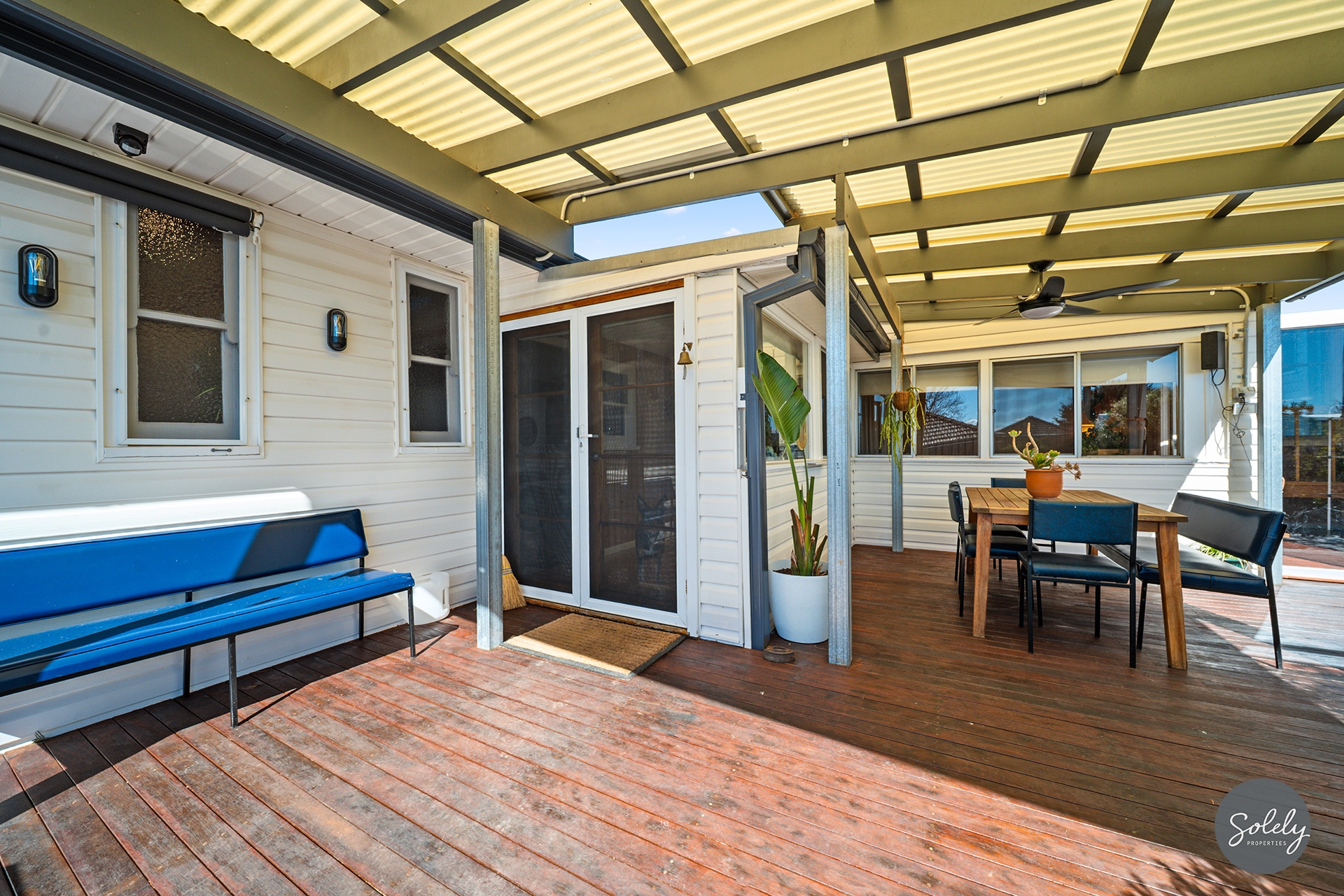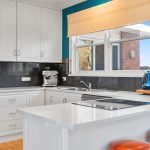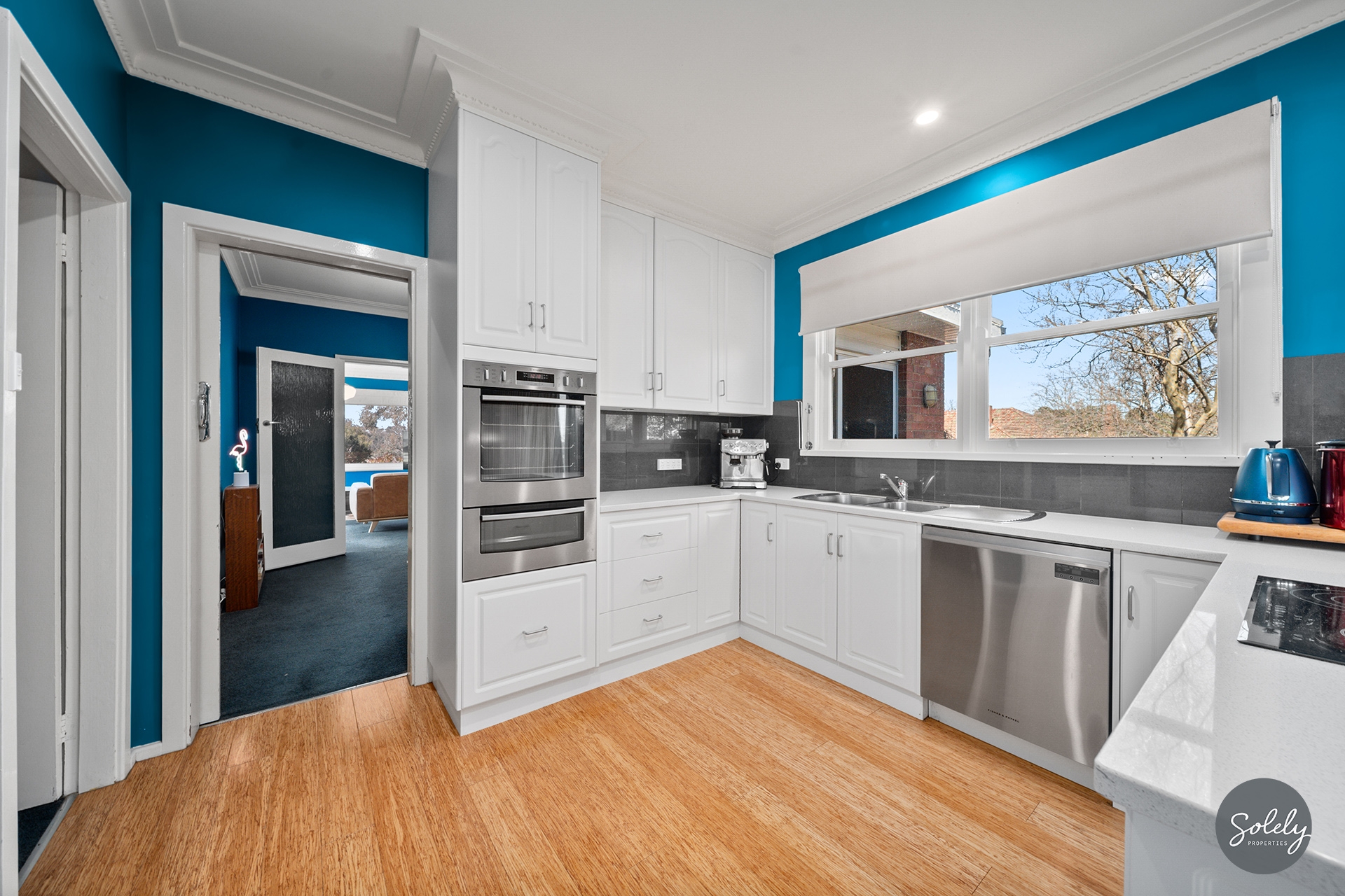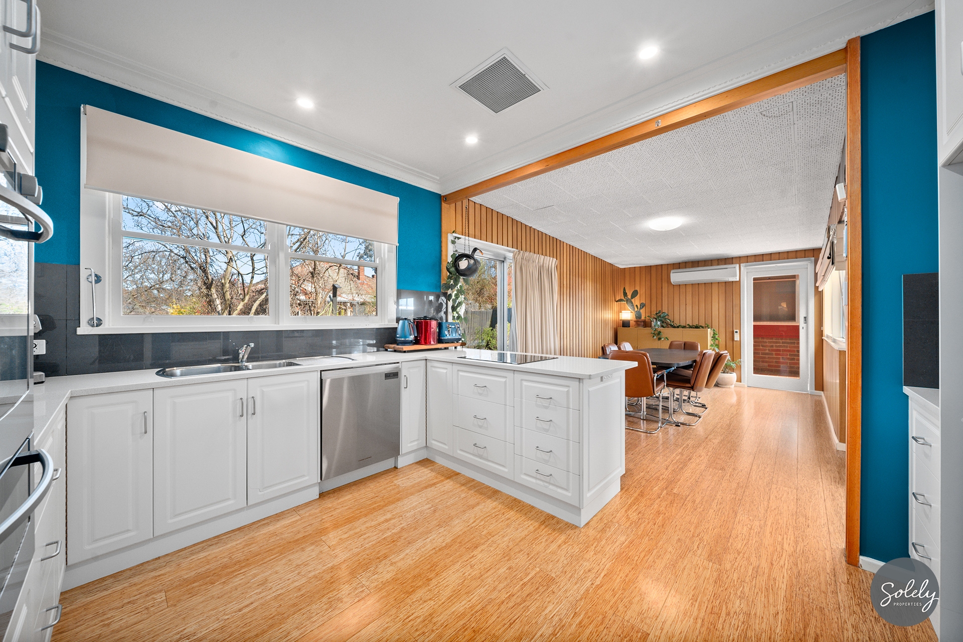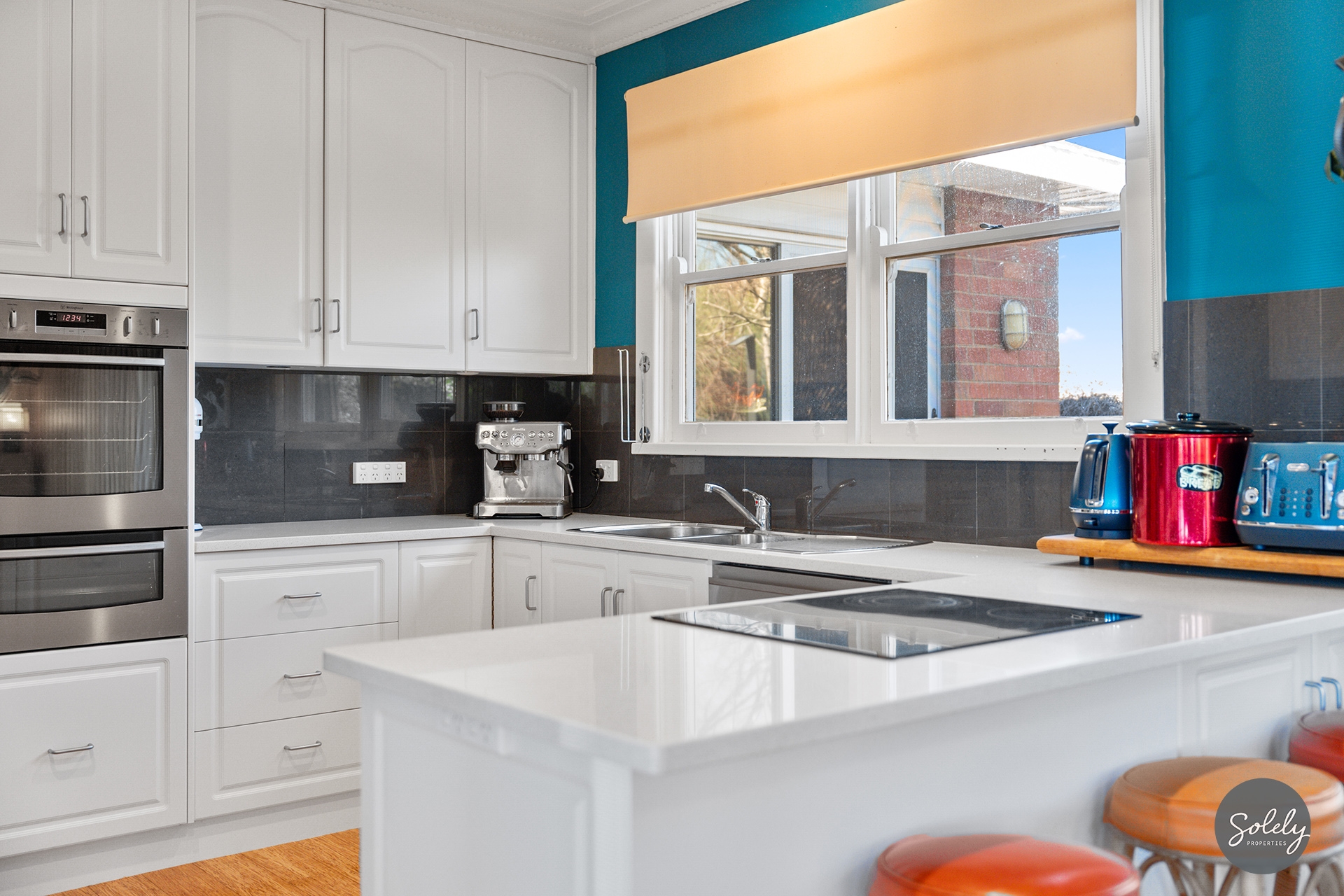 Living spaces are generous and practical. At the front, an elegant formal lounge and dining room create a welcoming place to gather, warmed by the slow-combustion fireplace. To the rear, the casual living area is filled with natural light and opens directly onto a large covered deck, ideal for year-round entertaining. The renovated kitchen connects easily to this space, with sleek white cabinetry and quality appliances.