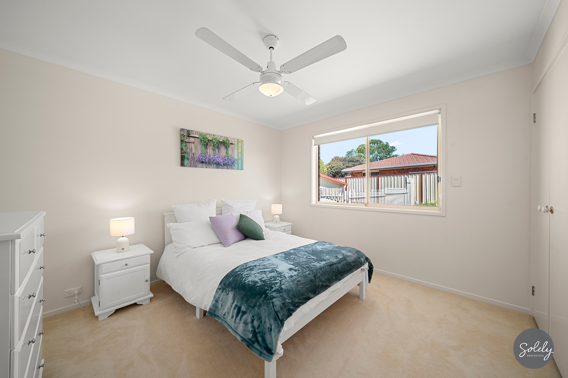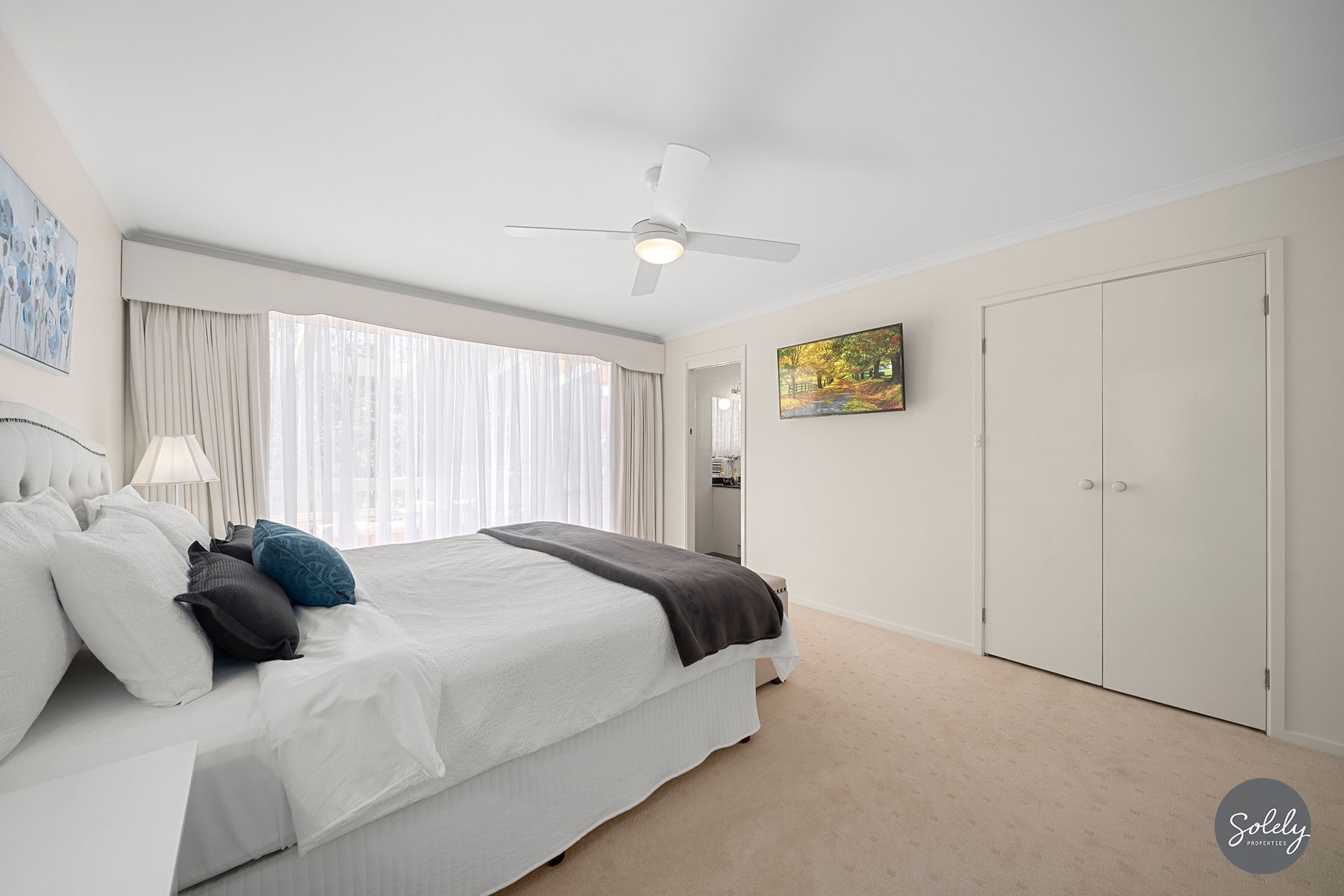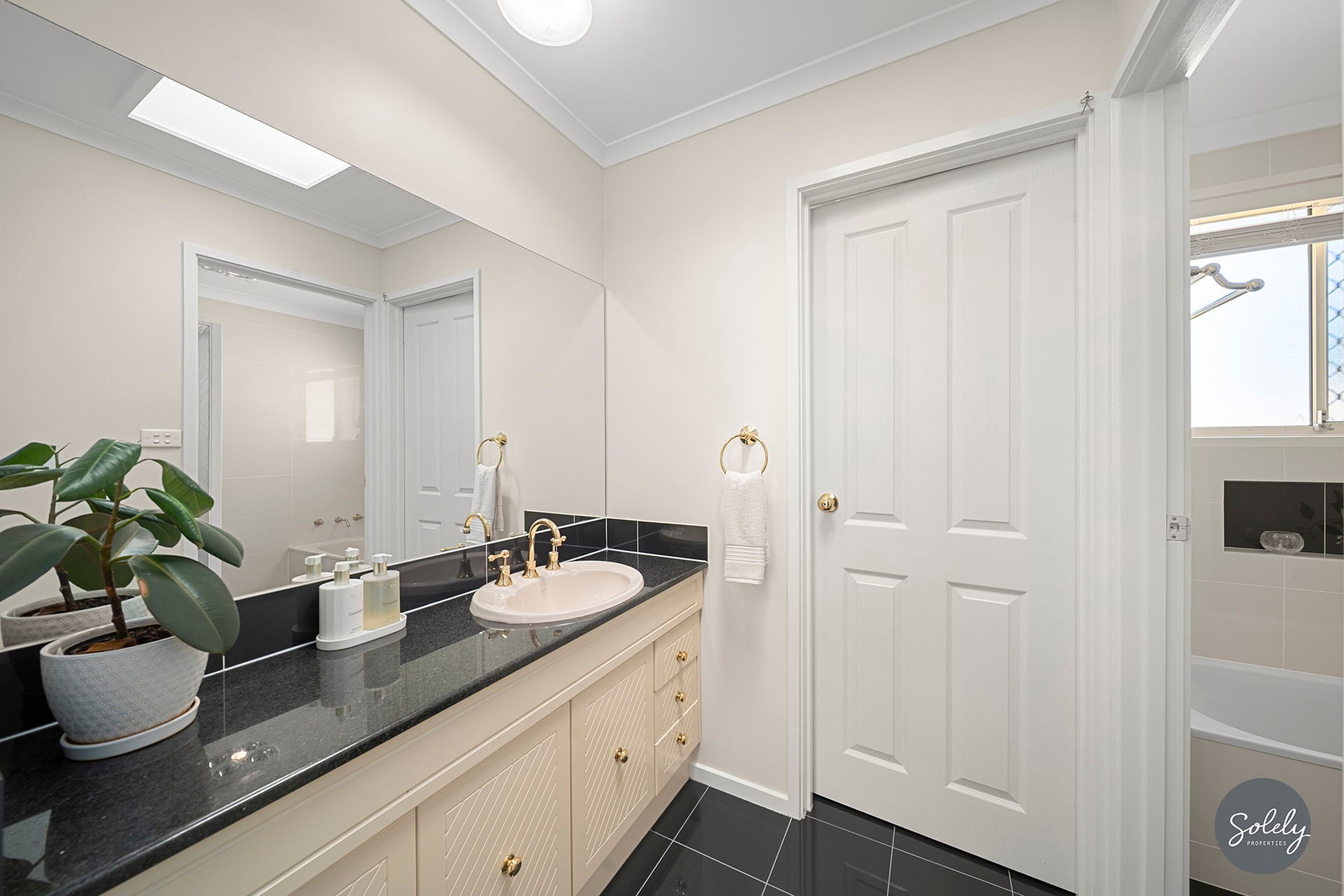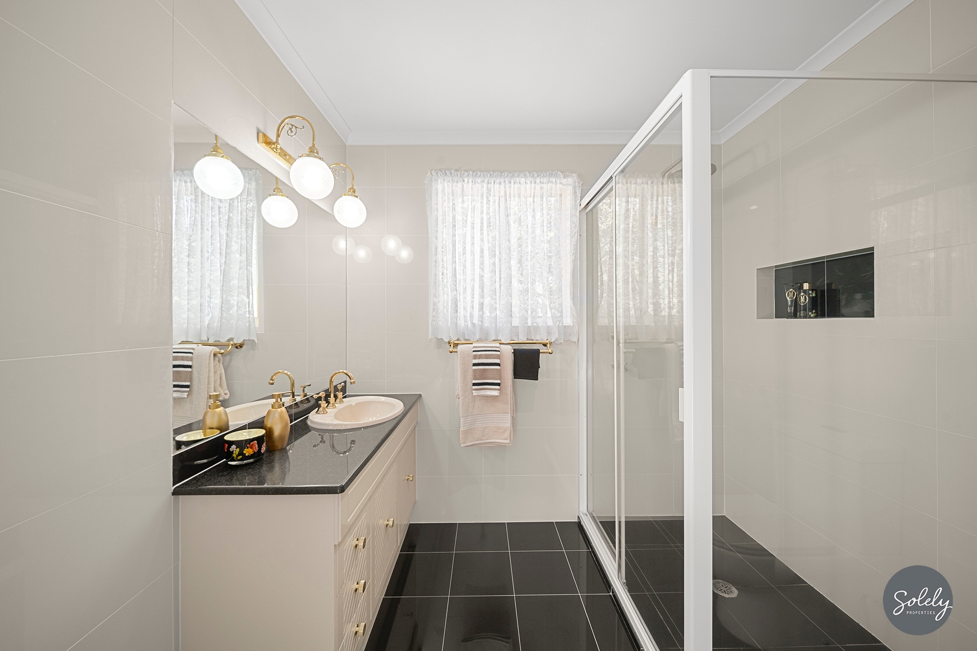 The north facing master bedroom is a bright and restful space, with natural light filling the room, a ceiling fan keeping the room comfortable and a walk-in robe with custom storage to keep everything neatly organised. The ensuite is quietly luxurious, with black floor tiles, floor-to-ceiling tiling, a granite vanity top, and a rainfall shower that feels like a small indulgence at the end of a busy day. The remaining three bedrooms are spacious and comfortable, with large built-in wardrobes. The updated main bathroom, cleverly separates bath, shower, powder room, and toilet, making mornings feel smoother for the whole family.