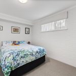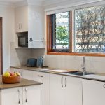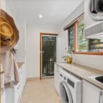 The renovated kitchen serves as the home’s centrepiece, combining bold style with high-end functionality. It is appointed with a black freestanding Belling electric oven and gas cooktop, an Asko dishwasher, and a stone island bench. The bold red glass splashback adds a bit of personality against the sleek cabinetry, which continues through into the adjacent laundry for a cohesive look.