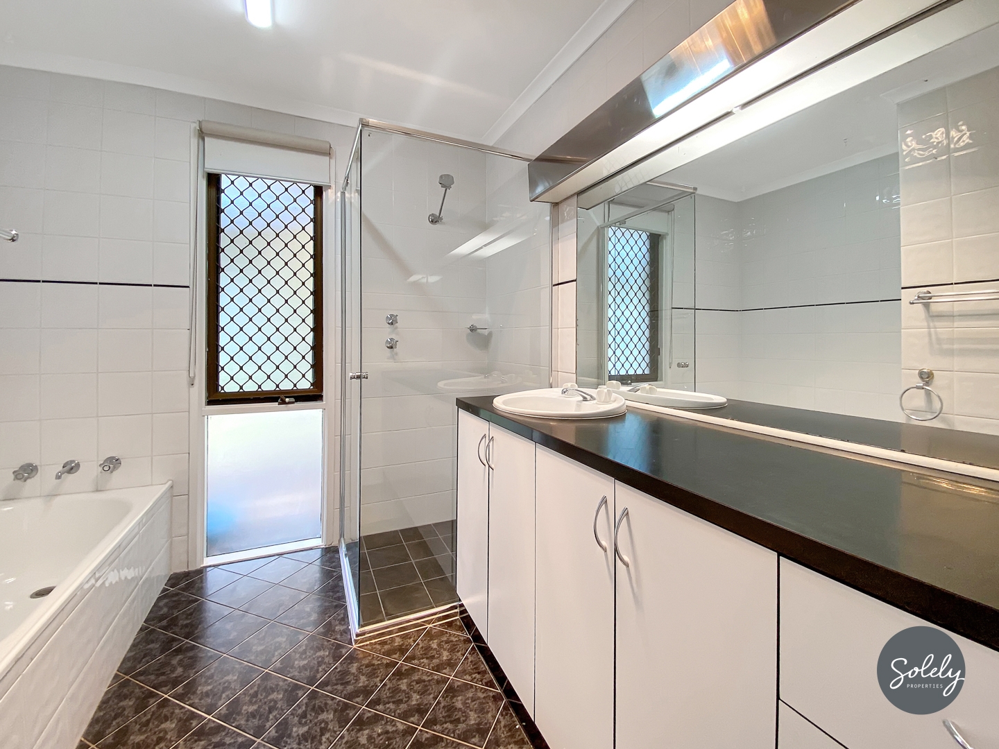 * Single-vanity bathroom with room to spread out, featuring both a bath and shower, plus a separate toilet