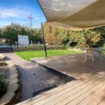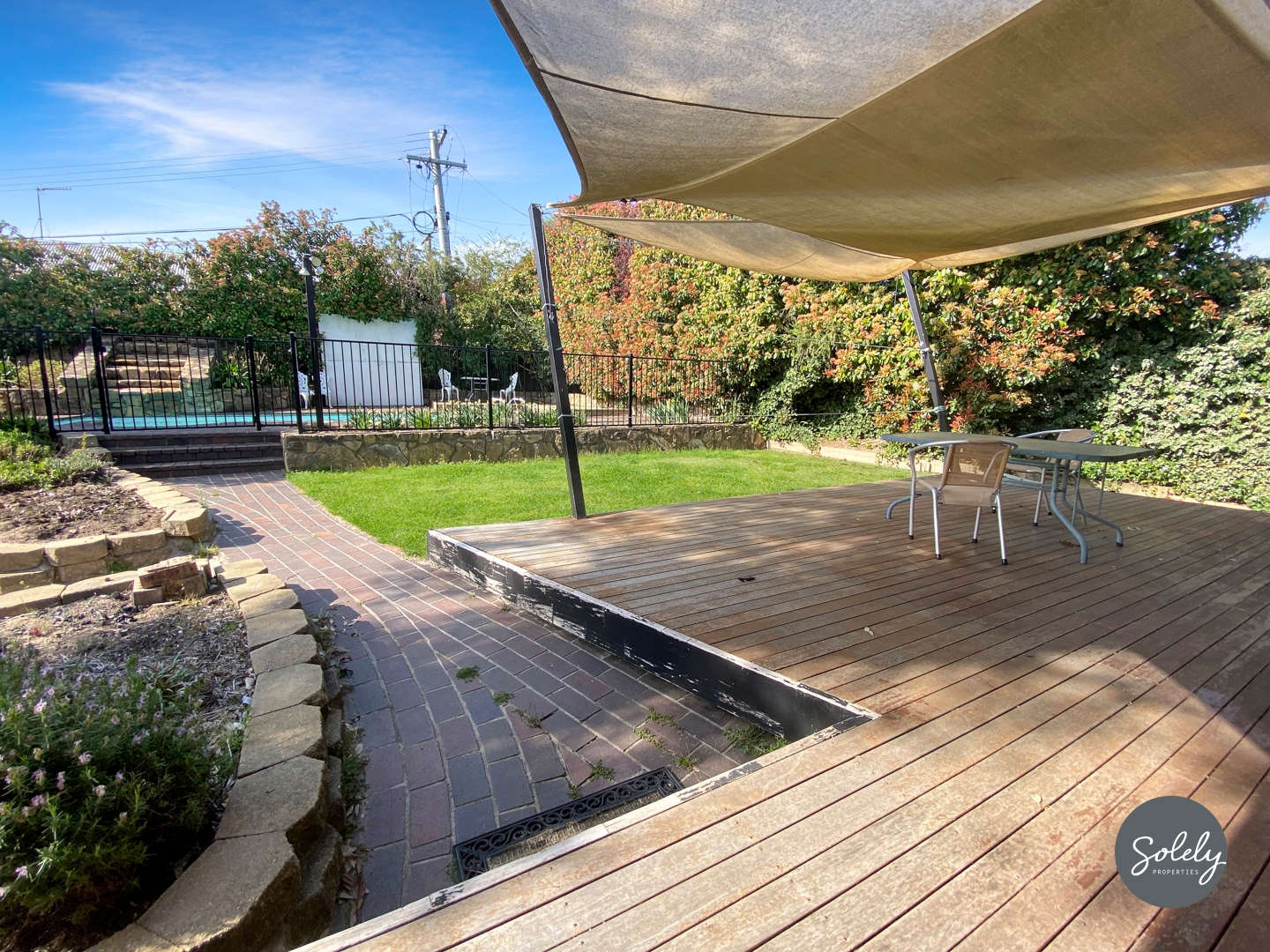 * Outdoor entertaining deck with a clear view across the pool and garden