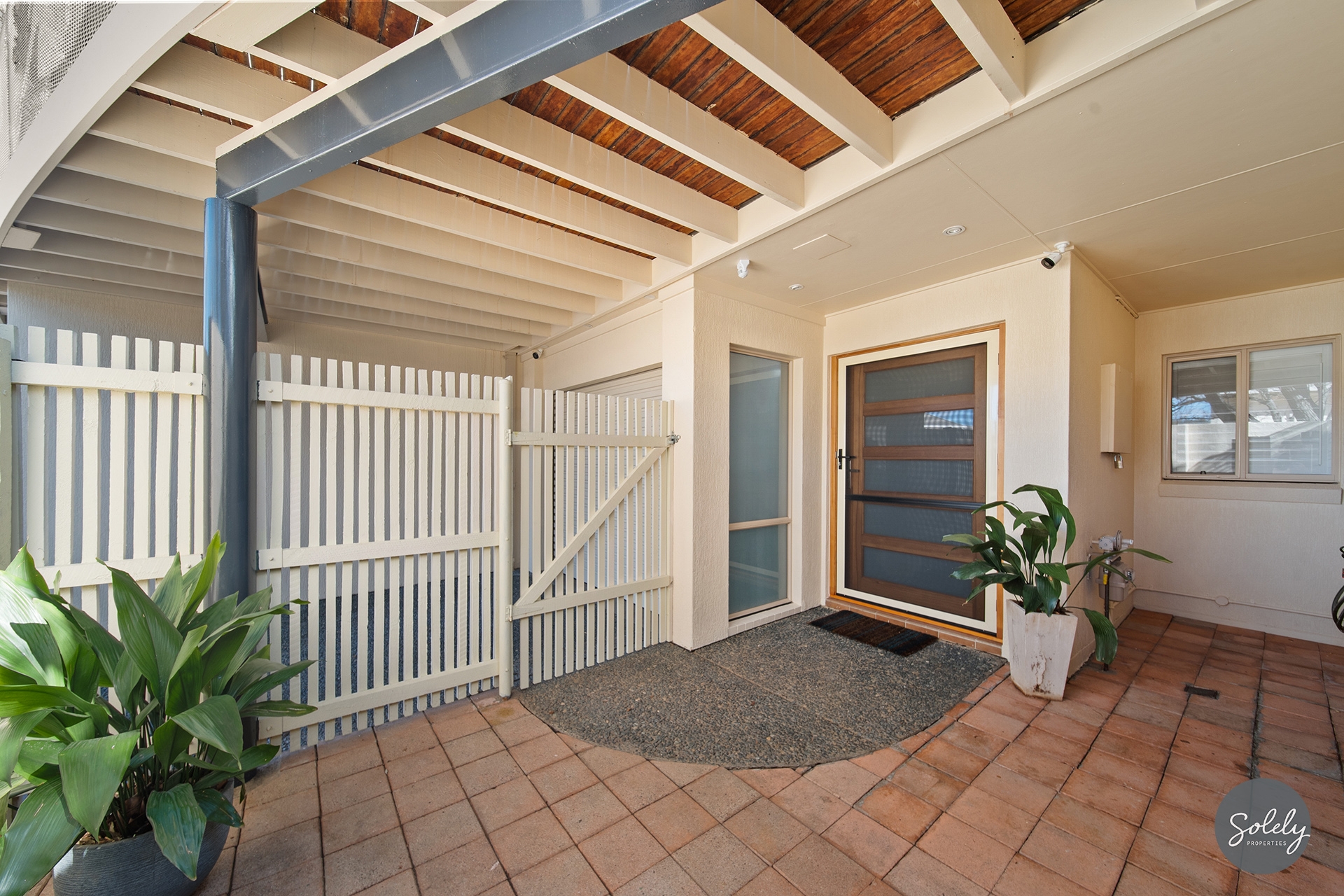 * Front paved courtyard with a nook for storage