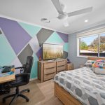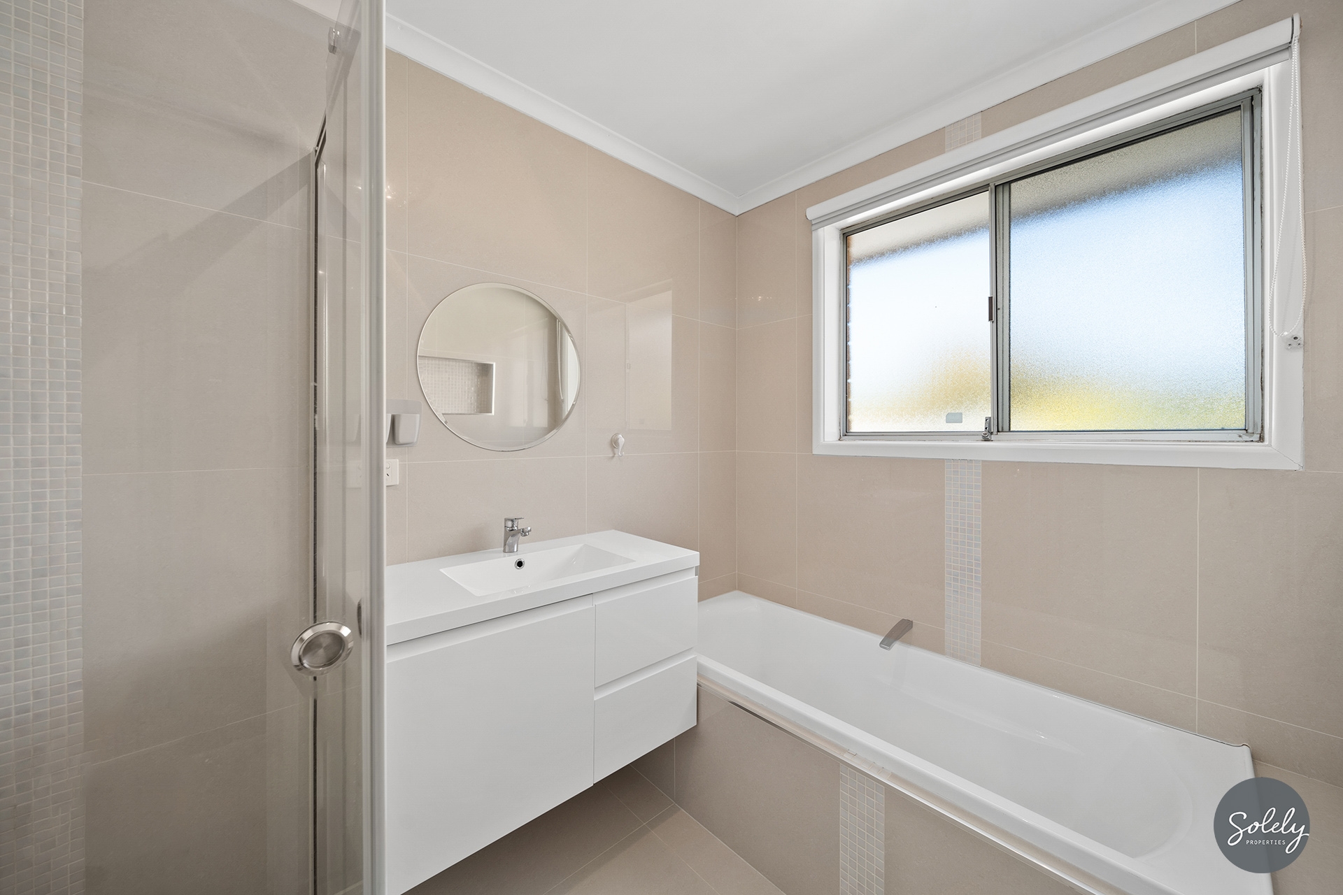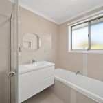 The bathroom feels fresh and functional, with full-height tiles, a floating vanity, a separate toilet and a bath for long soaks. The laundry has been updated too, echoing the kitchen’s finishes with smart storage and direct outdoor access.