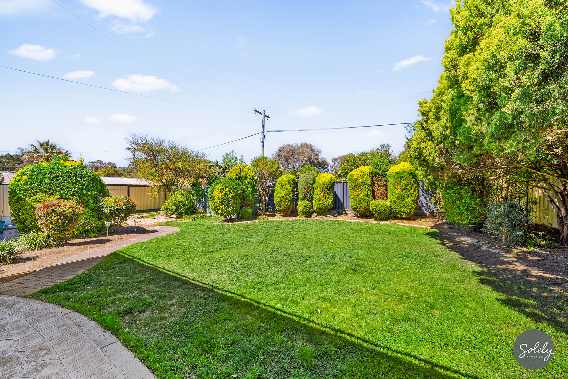 * At the rear, a secure Colorbond-fenced yard surrounds a grassed area with established gardens and fruit trees, including lemon, mandarin, and pomegranate. A large pergola shelters the patio, perfect for outdoor living, while a powered lockable storage room and garden shed add practical convenience