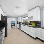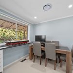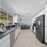 * The kitchen and dining area come together as a practical hub of the home, with an oversized breakfast bar that frames the outlook to the backyard. An induction cooktop, Fisher & Paykel oven and new twin-drawer dishwasher sit neatly within generous storage, while the black tiled splashback and under-cabinet lighting bring a modern edge to the space