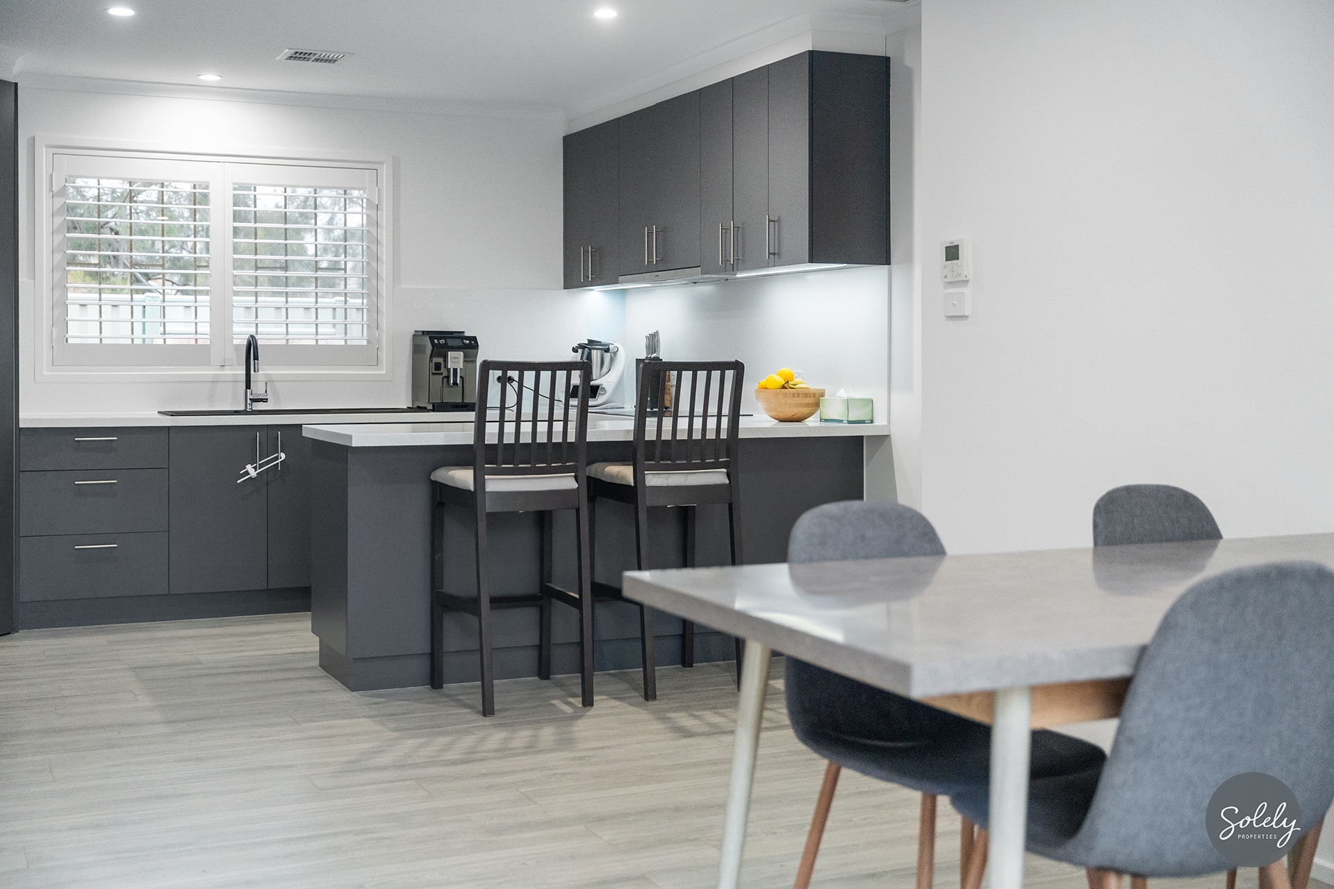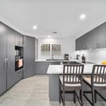 The kitchen itself is both practical and striking, with deep grey cabinetry, stone-style benches, a Bosch oven and dishwasher, and sleek Smeg induction cooktop with matching rangehood and its thoughtful layout brings efficiency to everyday cooking, with enough style to impress when it matters.