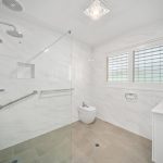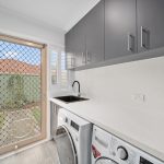 All three bedrooms feature built-in robes and soft carpet, while the bathroom delivers unexpected scale with floor-to-ceiling tiles, a rain plus handheld shower head, floating vanity, bidet and a separate toilet for guests or family ease. There’s also a fully fitted laundry with external access, and plantation shutters throughout for privacy.