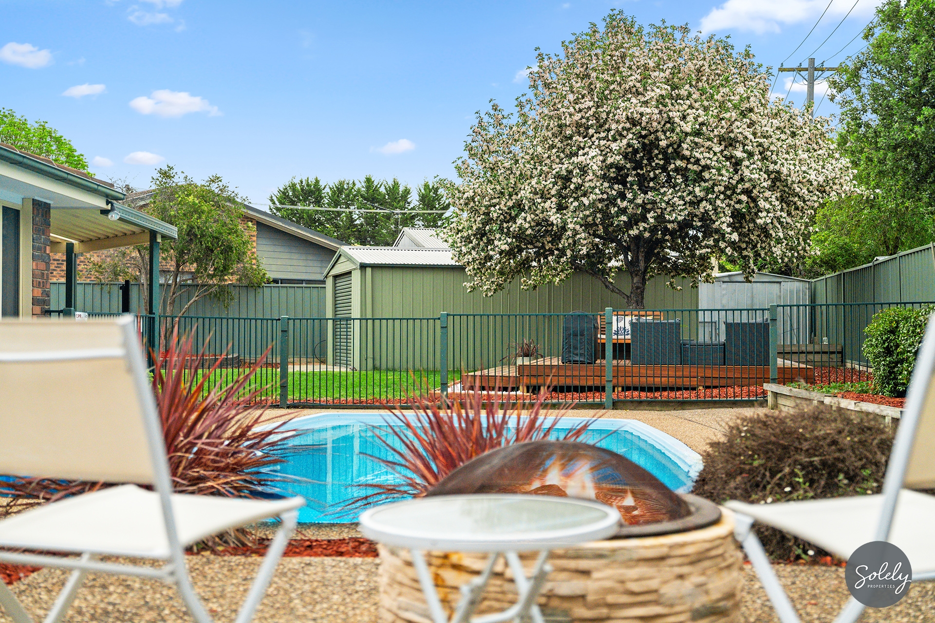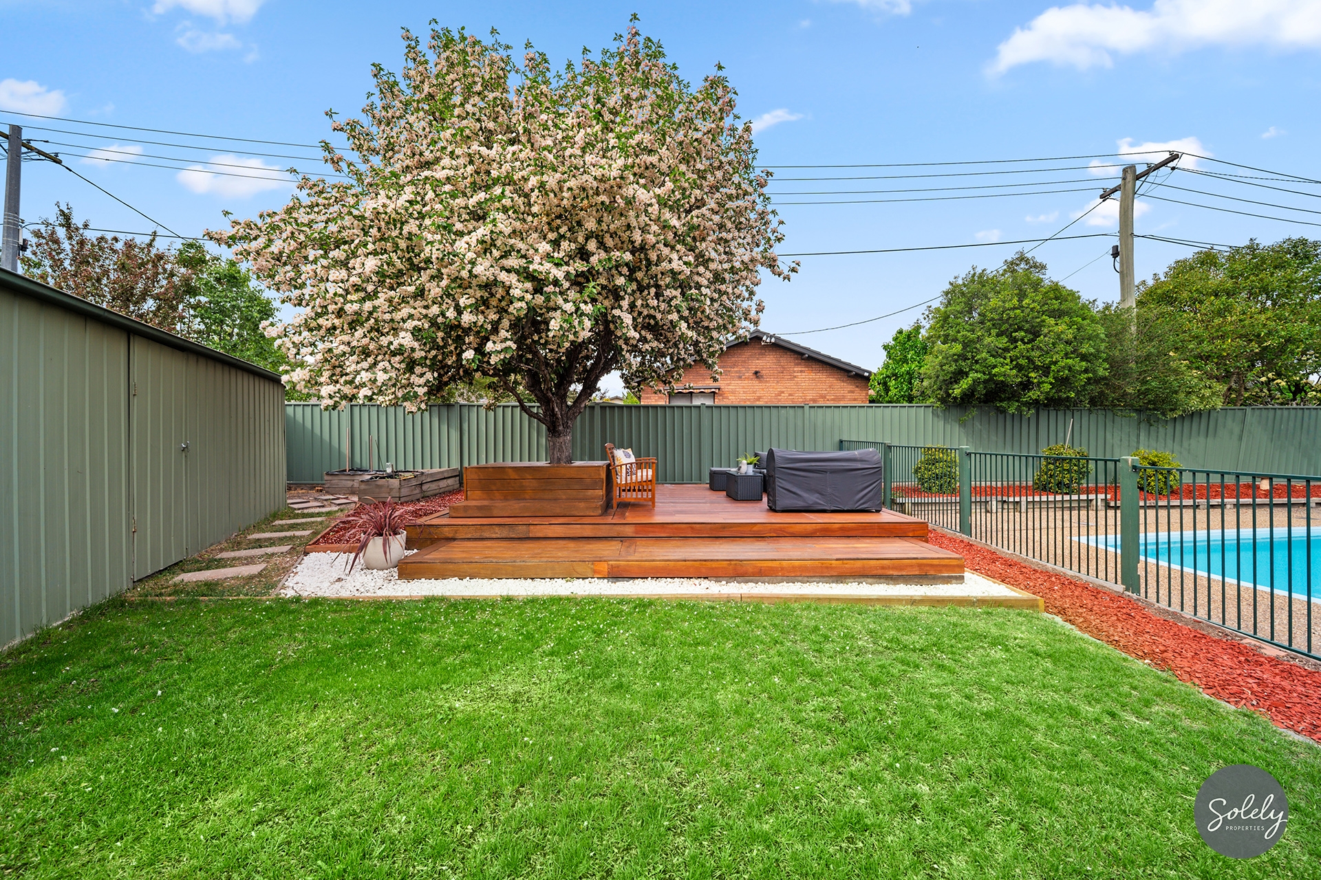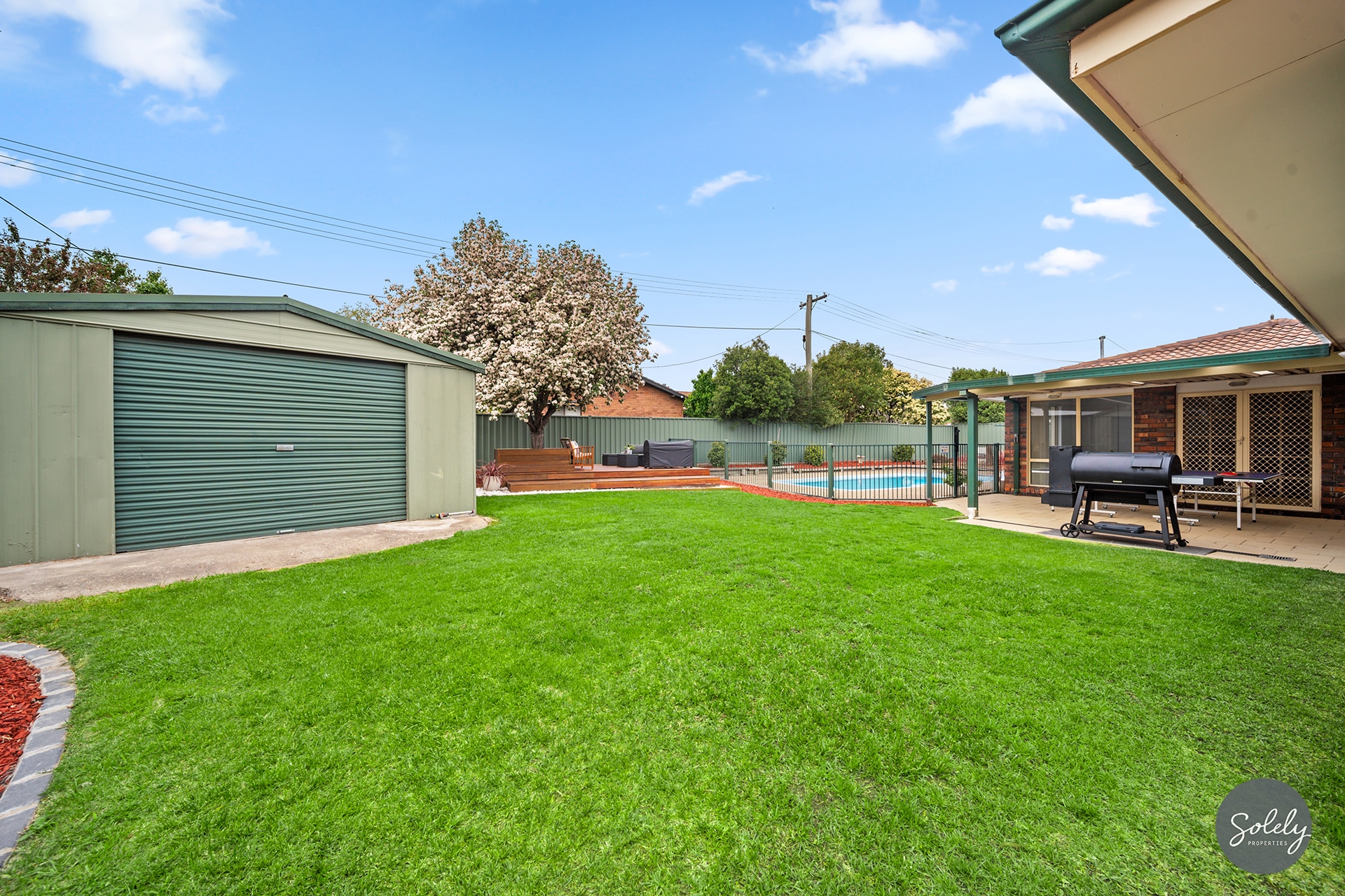 * Beautifully landscaped gardens framed by Colorbond fencing, with mature plants and a large lawn