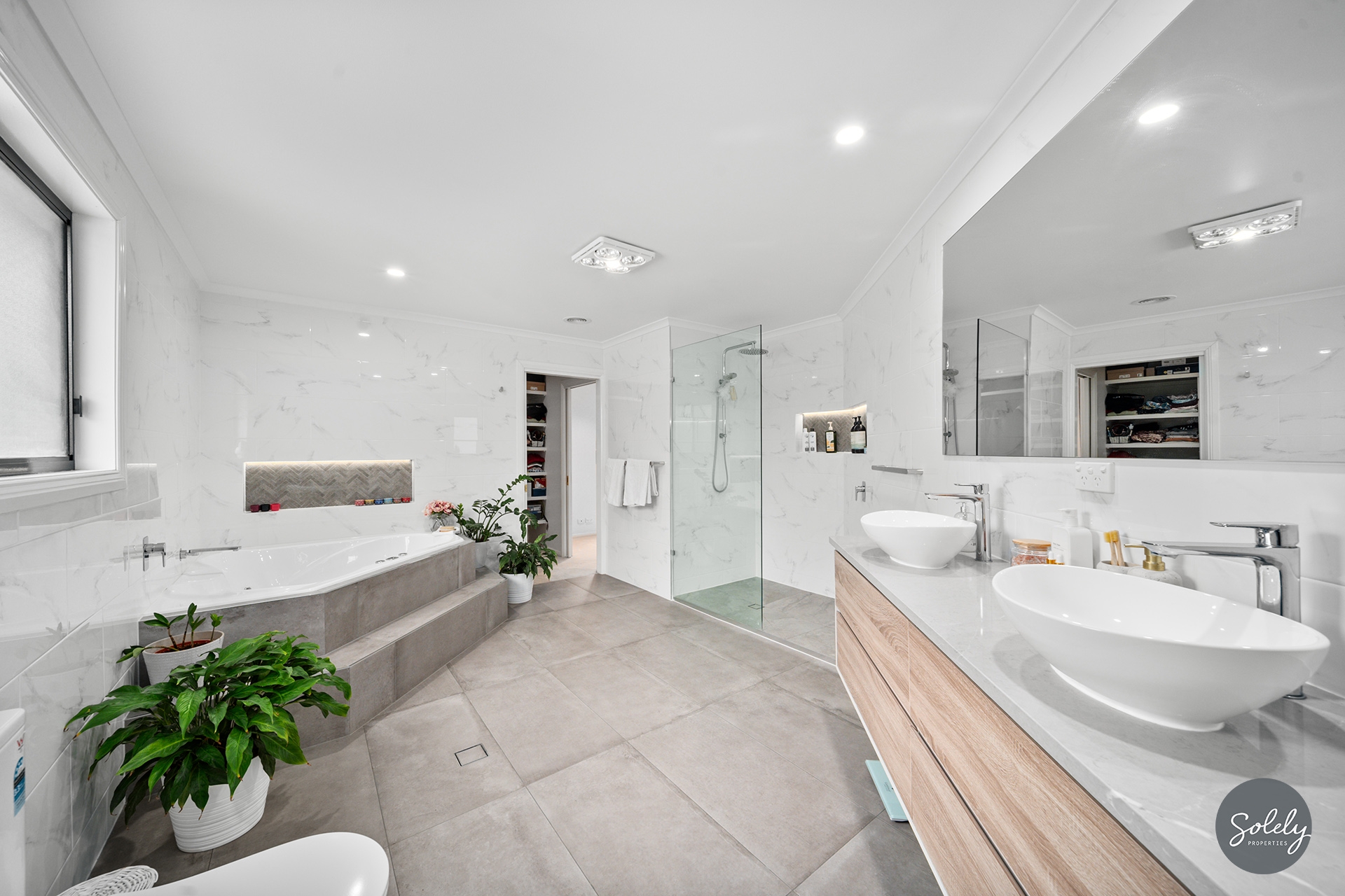* The main bedroom is privately positioned and opens to the outdoors, featuring a walk-in robe and a show stopping two-way ensuite renovated in 2021. Designed for indulgence, it boasts full-height tiling, a sleek twin basin vanity, a frameless shower with both rain and handheld heads, and a luxurious corner spa-offering a true retreat at home