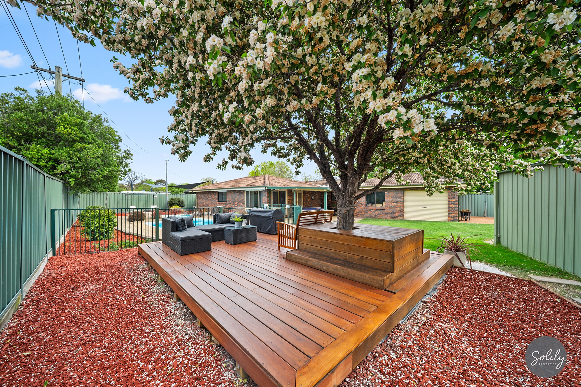 * A unique, new decked bench wraps around a Crab Apple tree, creating a perfect spot to relax while overlooking the pool