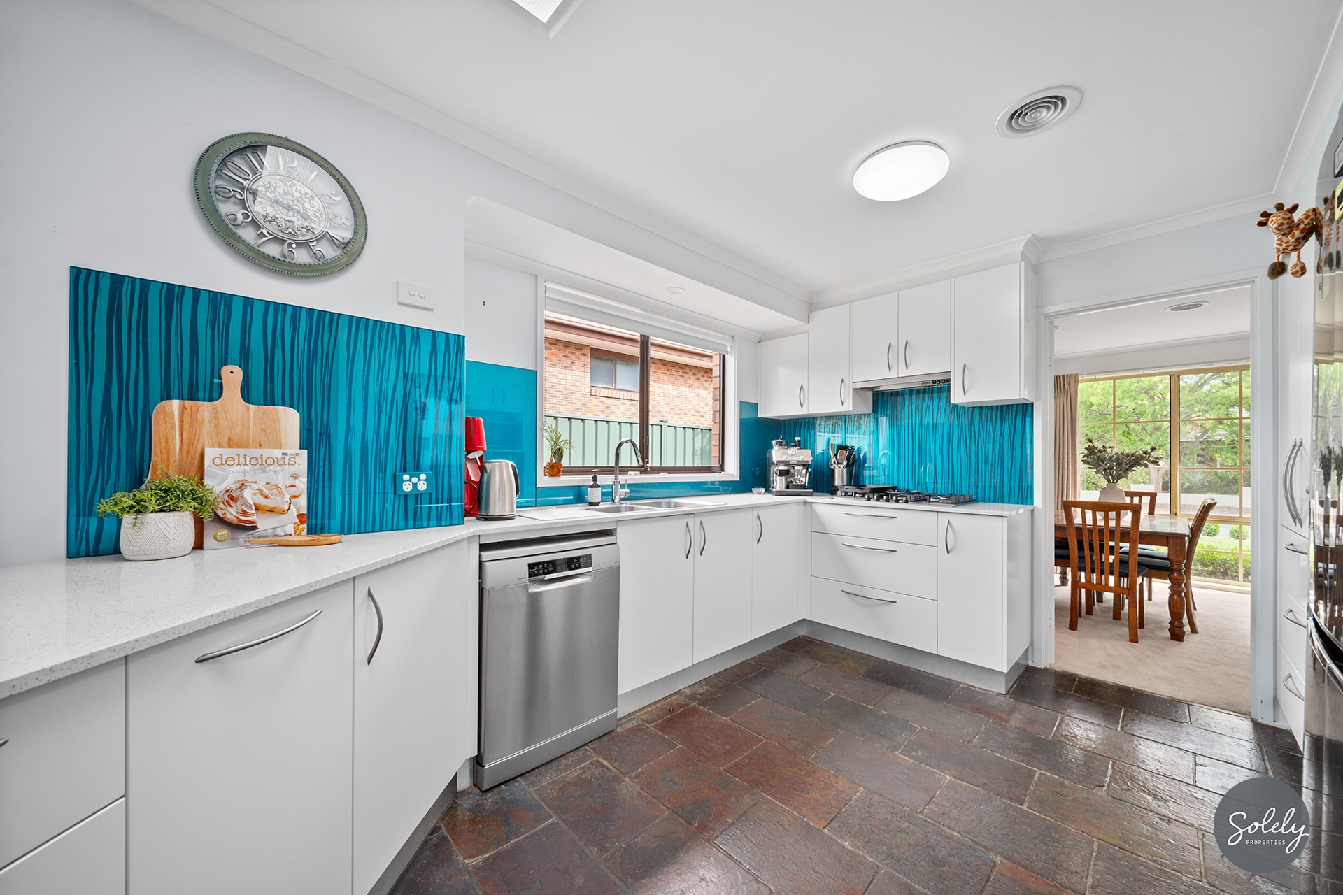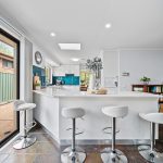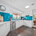 * The kitchen is both stylish and functional, featuring a 20mm Caesarstone benchtop, striking glass splashback, breakfast bar, and ample storage. Premium stainless steel appliances include a Bosch gas cooktop, a Siemens pyrolytic oven, a Qasair rangehood, and a new Bosch dishwasher