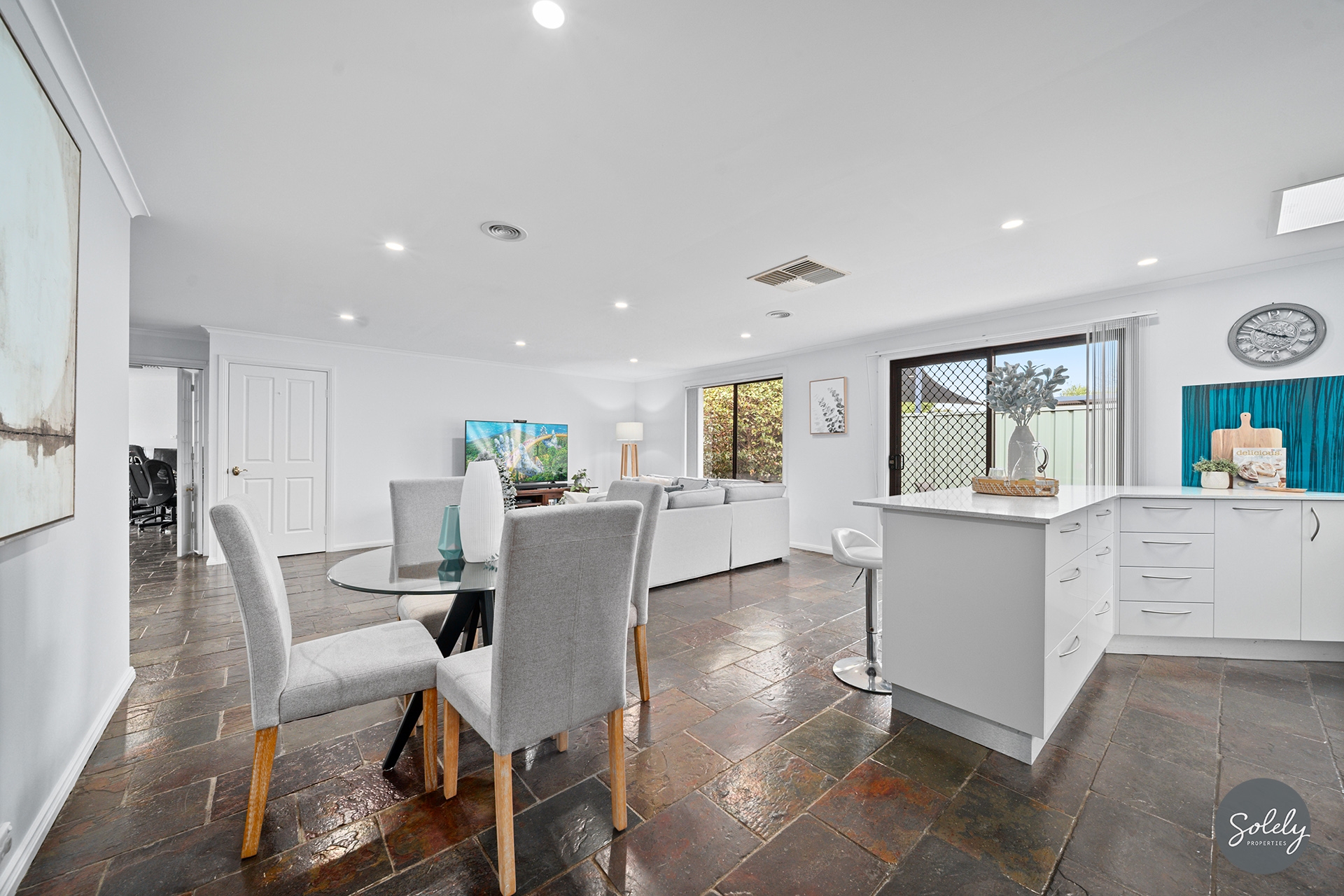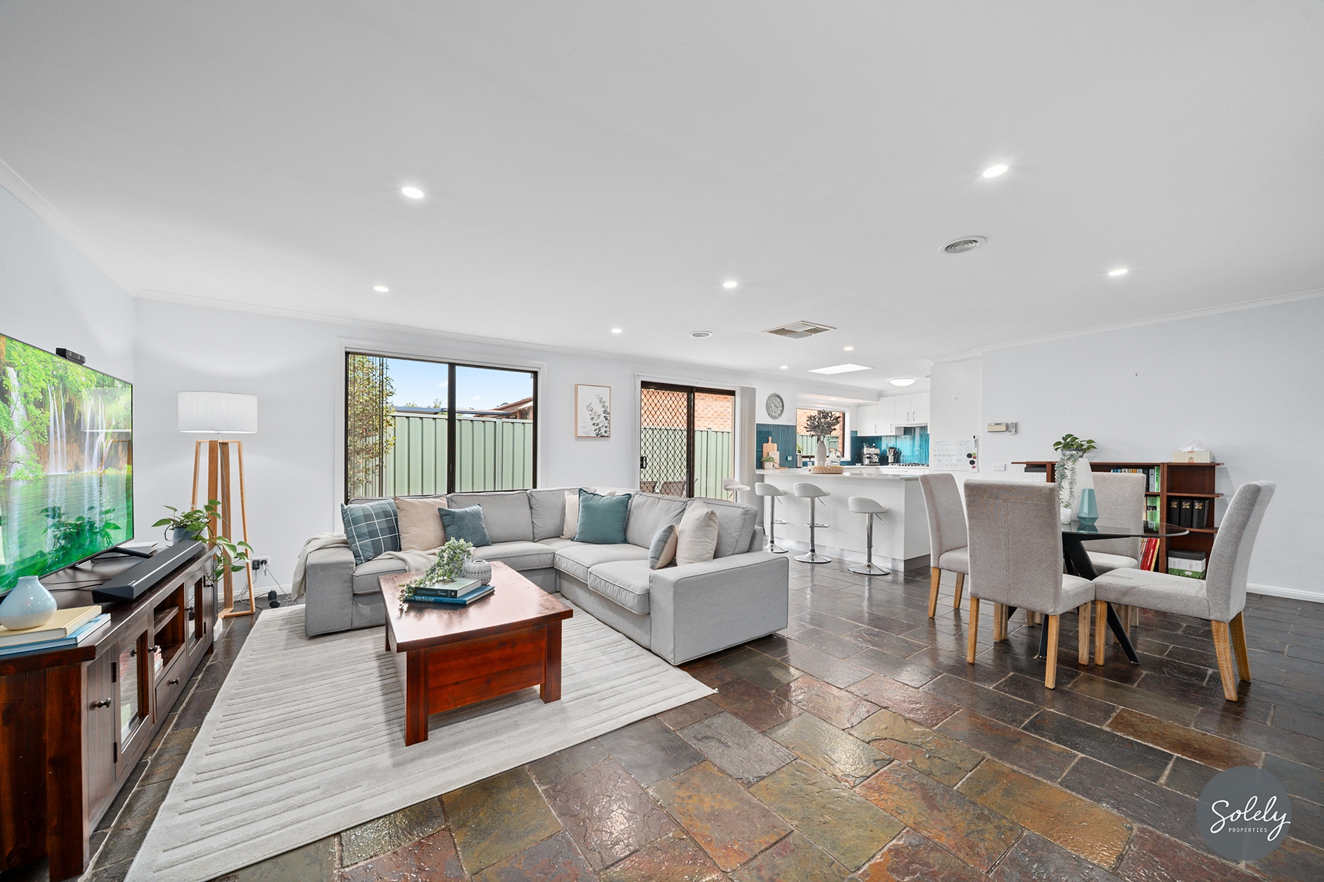 * Slate flooring in the kitchen, family/meals, and rumpus areas offers natural durability and a unique textured look, providing a sturdy surface that’s easy to maintain and hard-wearing for busy family living